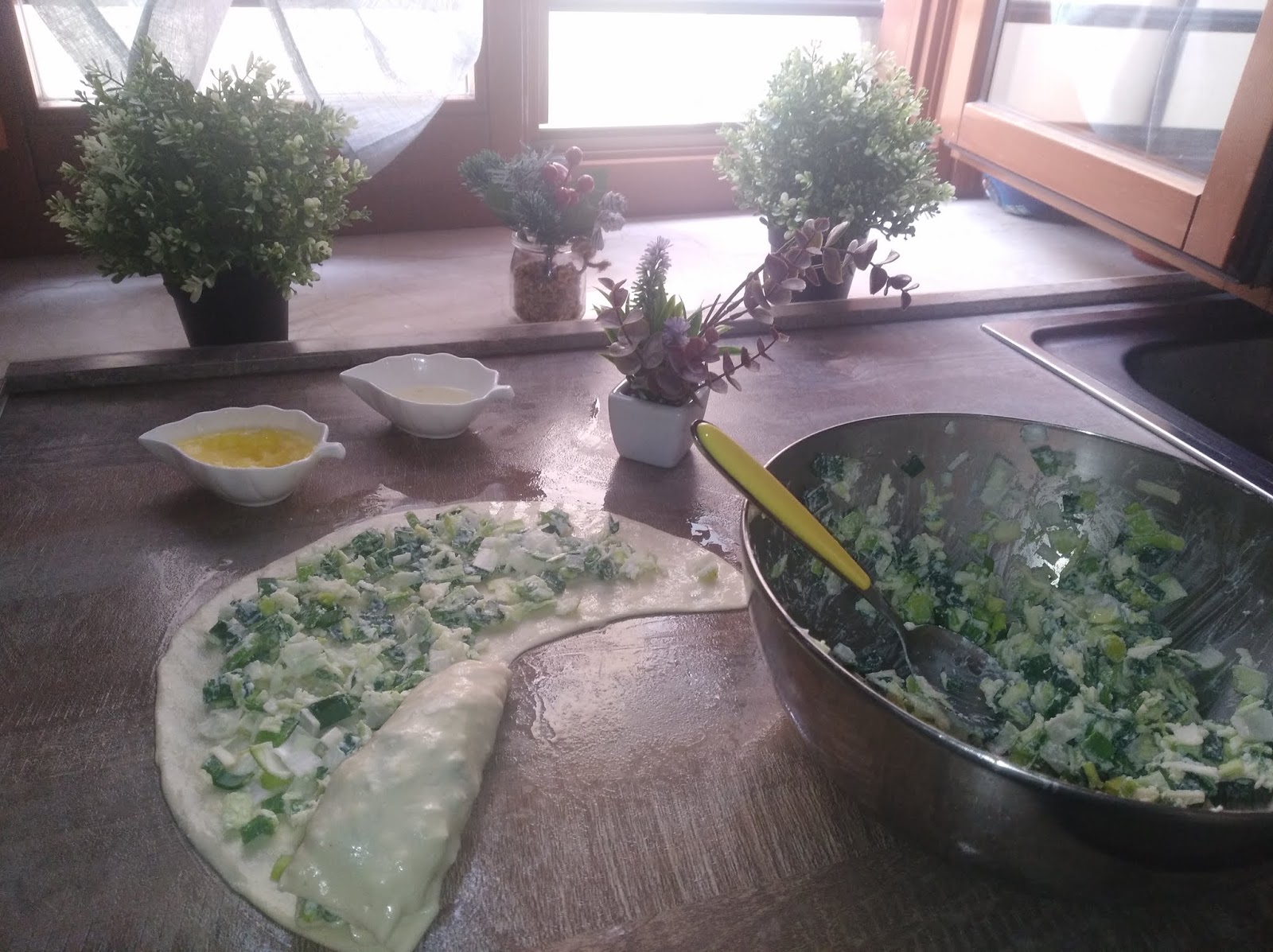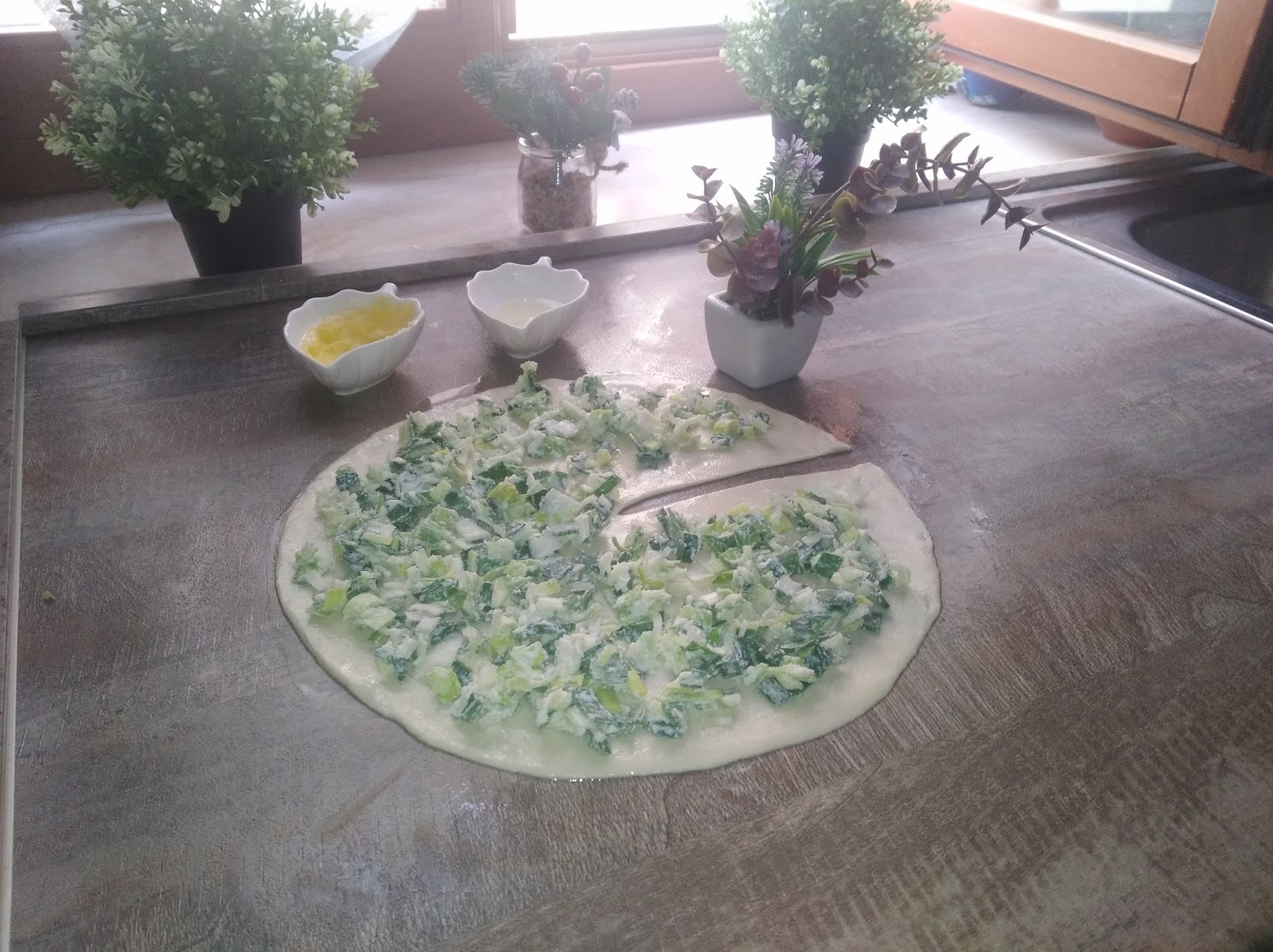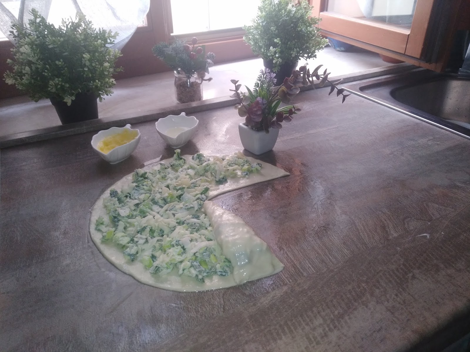 نضع الحشوة بالتساوي فوق عجين الملوي