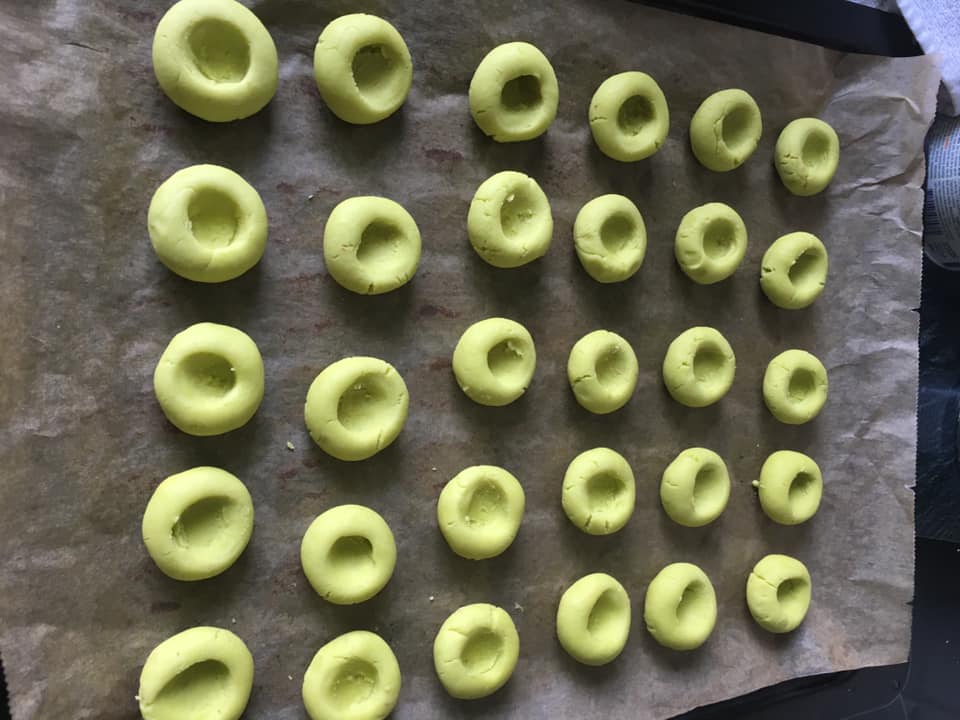 نشكل من عجين غريبة كويرات نعمل وسطها حفرة كما هو موظح في الصورة