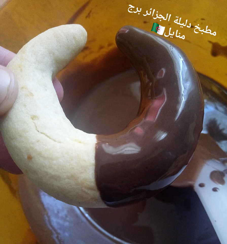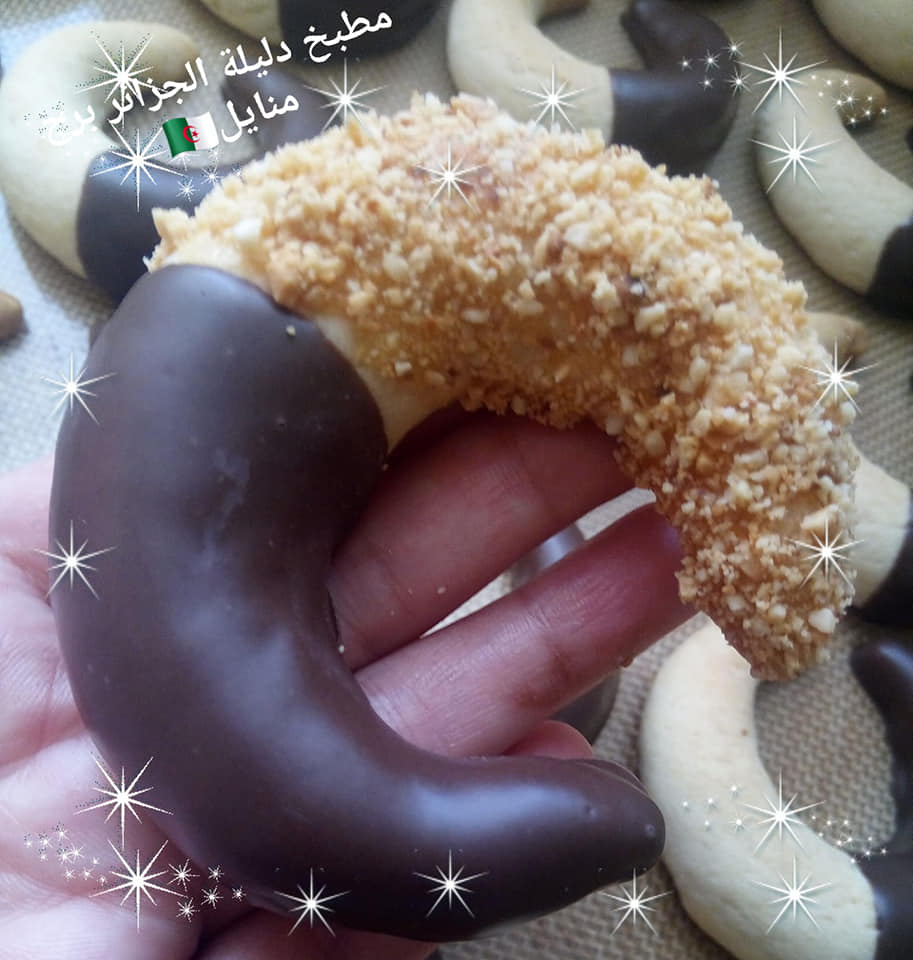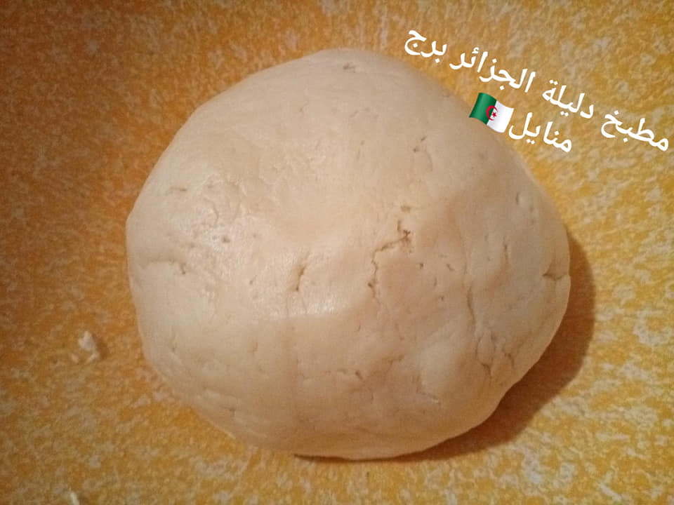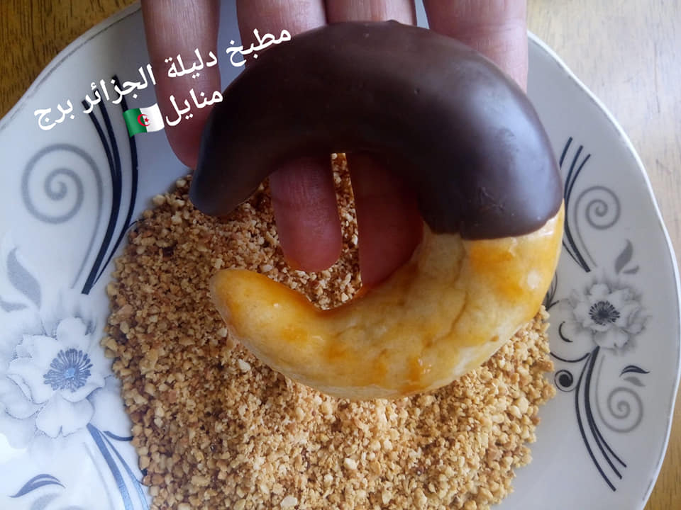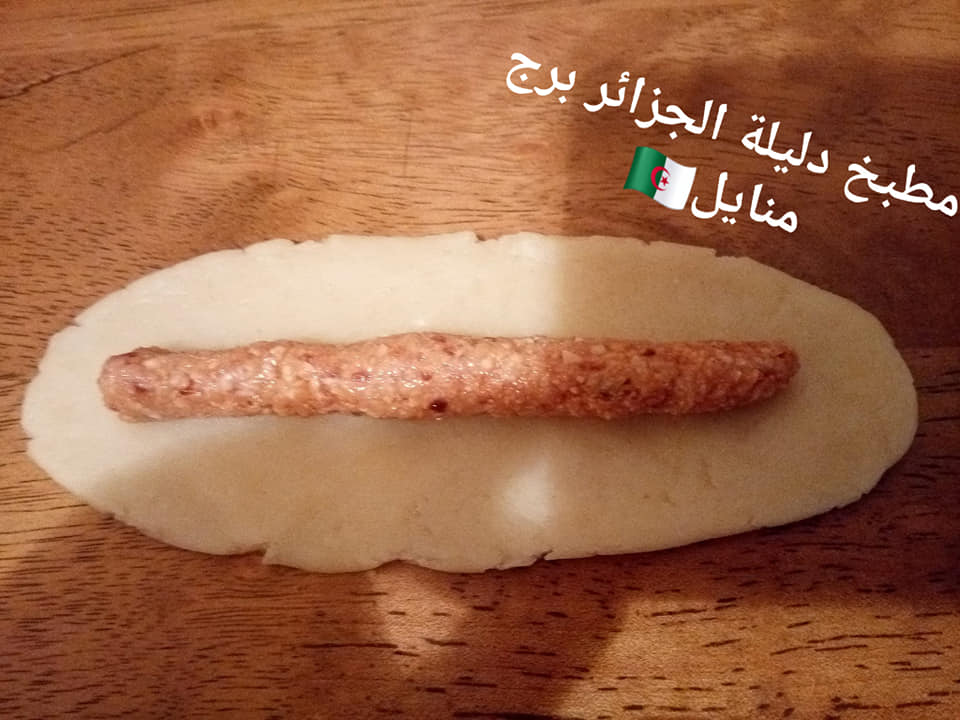 نشكل من عجين حلوة الهلال كريات من وزن 25 غ و نبسطها بالحلال اي المدلك نحشيها و نشكل الحلوة على شكل هلال