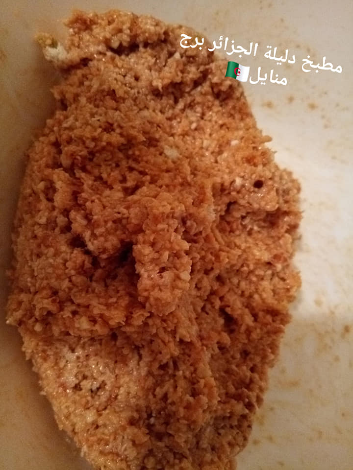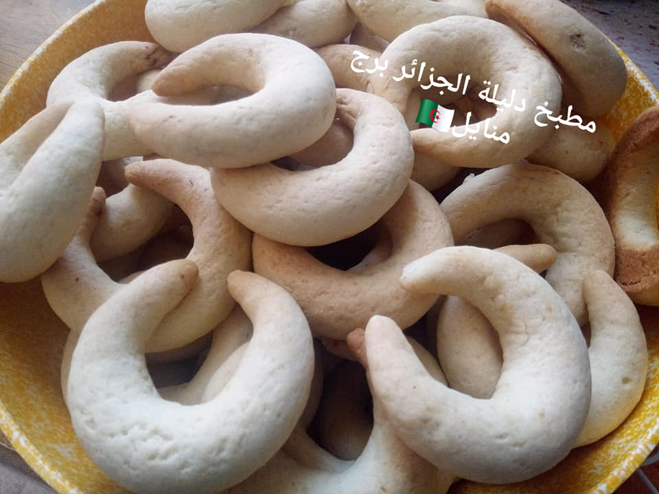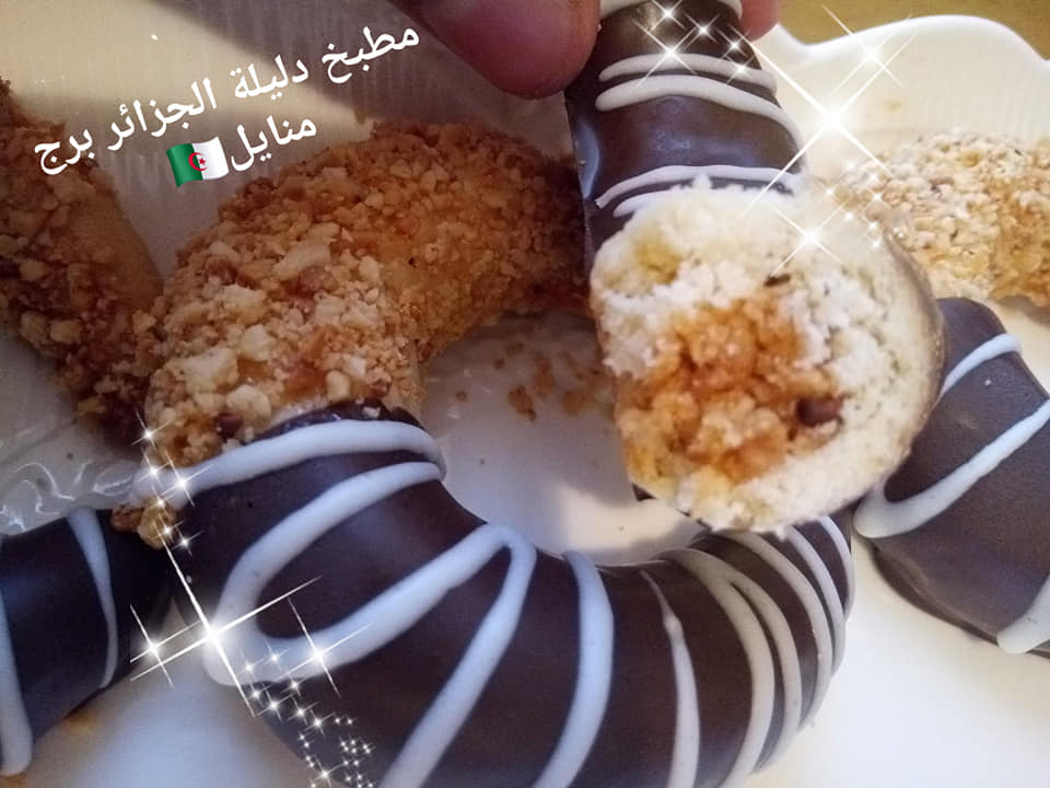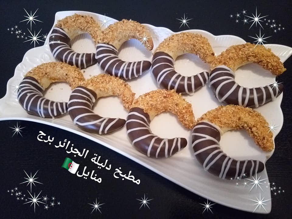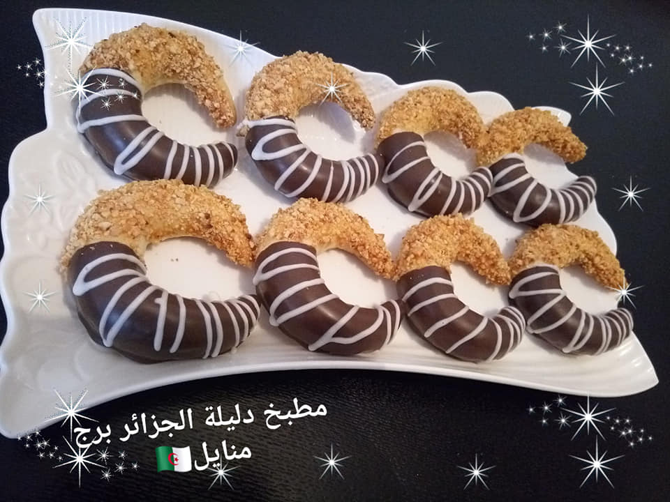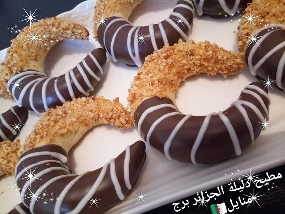 نشكل من عجين حلوة الهلال كريات من وزن 25 غ و نبسطها بالحلال اي المدلك نحشيها و نشكل الحلوة على شكل هلال