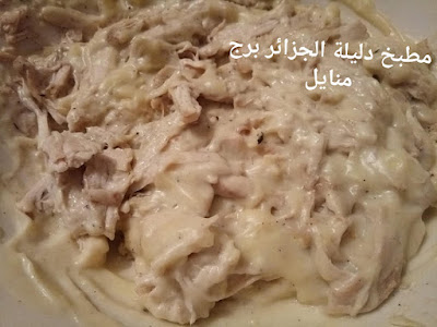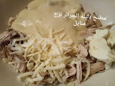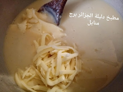 نخلط الزبدة و الدقيق في كسرونة حتى يتجانسو ثم نضيف كأس مرق دجاج مع التحريك ثم نضيف كأس و نصف حليب نحرك حتى تعقد ثم نضيف الجبن ثم نخلطها مع الدجاج