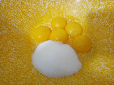 نخفق صفار البيض مع نصف كمية السكر المتبقي حتى يصبح لونه ابيض
