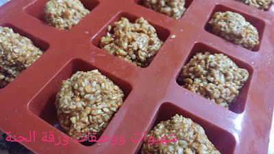 نشكل من خليط النوكا كويرات و نضعها في قوالب السلكون و نضغط عليها لتأخذ شكل القوالب
