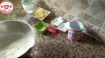 في إناء نضع جميع مكونات العجين نجمع بالماء دافئ أو عادي نقسمها ل2كويرات نبسطها على شكل مستطيل