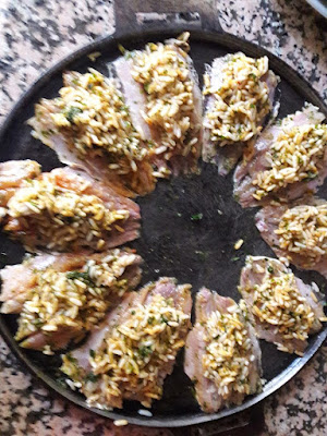 ناخذ سردين منقي من الشوك نشرملوه ب : ثوم معدنوس شوي قزبر ملح كمون ابزار سكينجبير شوي خرقوم شوي زيت وناخد الروز نكون صلقناه وقطرناه مزيان ونديرلو شوي ربيع حتى هو وشوي ملح ابزار شوي تحميرة شوي خرقوم . ناحد طاوة الفران او مقلة تقيلة ندهنها بزيت نحط السردين نعمرو بالروز ونغطيه بحبة سردين اخرى وندخلو للفران يطيب يتقدم مع خضيرة او بحدو وبالصحة والراحة😊😊 طريقة ساهلة وتيجي بنين