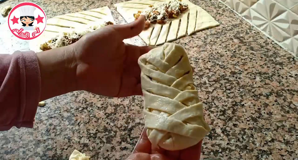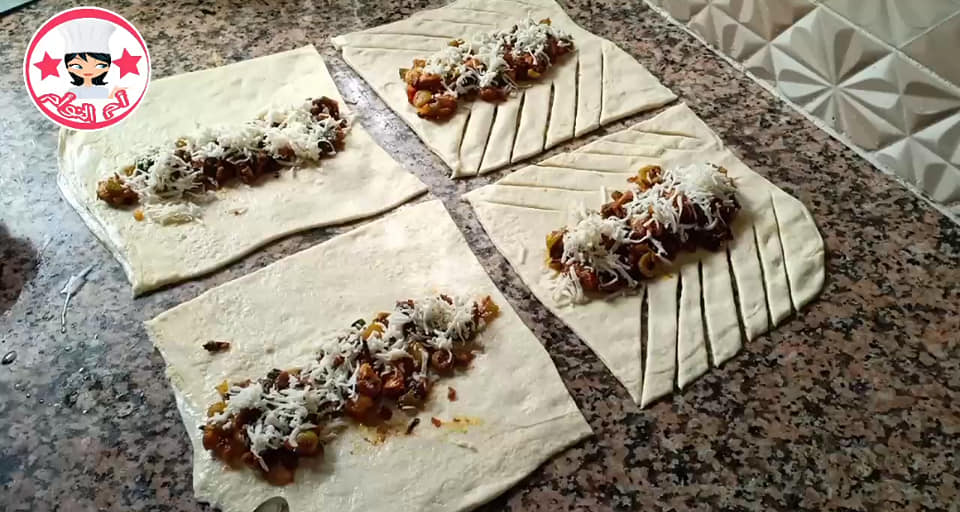 نضع حشوة فوق عجين المملحات و نقطع شرائط للحصول على مملحات على شكل ظفيرة