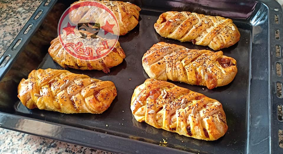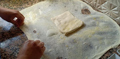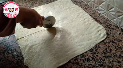 تطوى العجين مثل المسمن نضع واحدة وسط الاخرى كما في الصورة