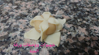 نضع عقدة اللوز في الوسط نلصع العجين من الوسط و نلصق الاطراف مع بعض