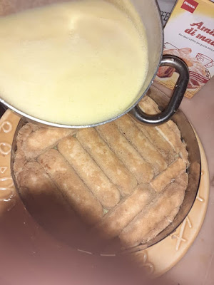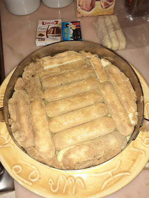في اطار دائري او حسب الرغبة نصفف ليبدوار بعدما نغطسهم في الحليب المخلط مع الكاكاو كطبقة اولى للكيك البارد