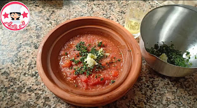 في طاجين نضع مطيشة و الربيع و الثوم و اناء اخر نضع الربيع و الثوم لتحضير السردين و نضيف اليهم التوابل