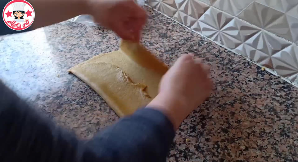 تبسط العجين رقيقة جدا و تقطع شرائط كما في الصورة