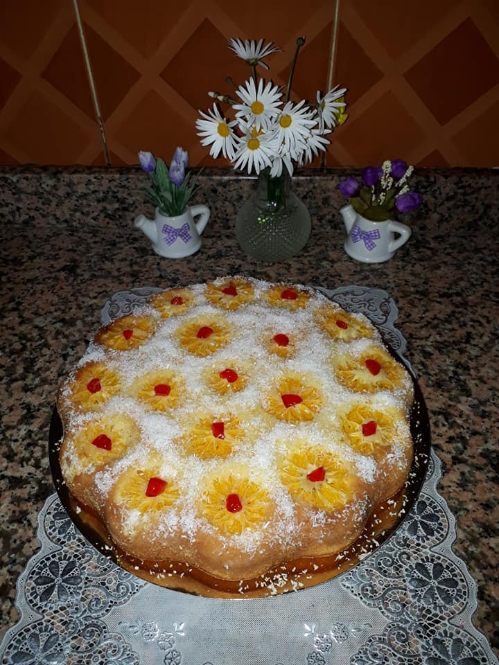 و نكب الخليط و تطهى حتى تتحمر الجوانب و ثم نحمر الوجه على نار قليلة عندما تخرج من الفرن تسقى بسيرو باررد أنا استعملت 2 معالق عسل دوبتهم فكاس ماء سخون خليتهم حتى بردو وسقيت بيهم انا ما كثرتش السيرو ونتوما حسب الذوق كتبرد مزيان نقلبوها وتزين بالكوك ولا حسب الرغبة