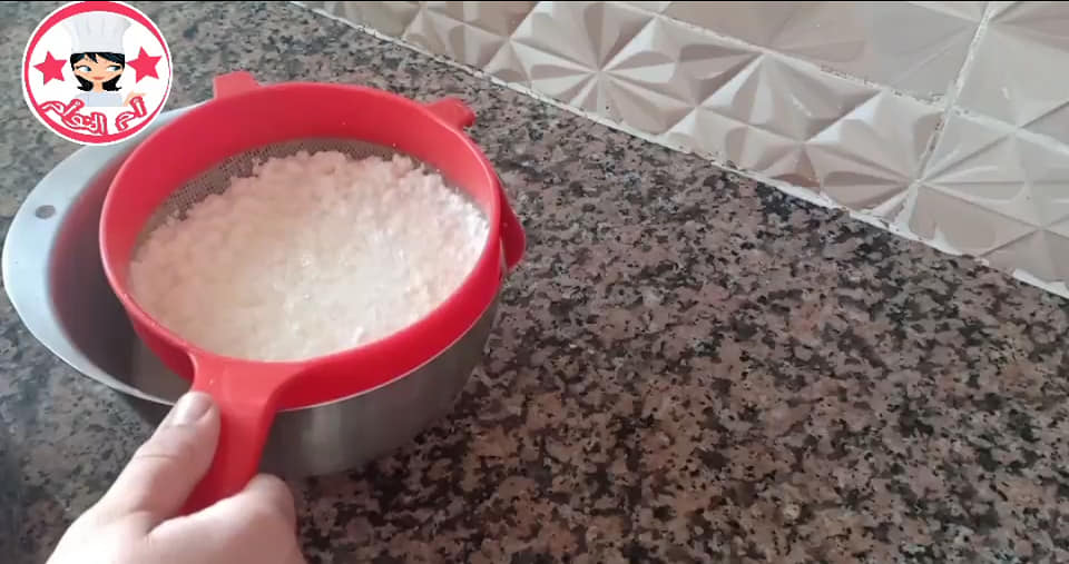 بعد ذلك يصفى اما في صفاية او من الاحسن ثوب حياتي ممكن تنسيمه بالزعتر او الازير او الثوم بودرة