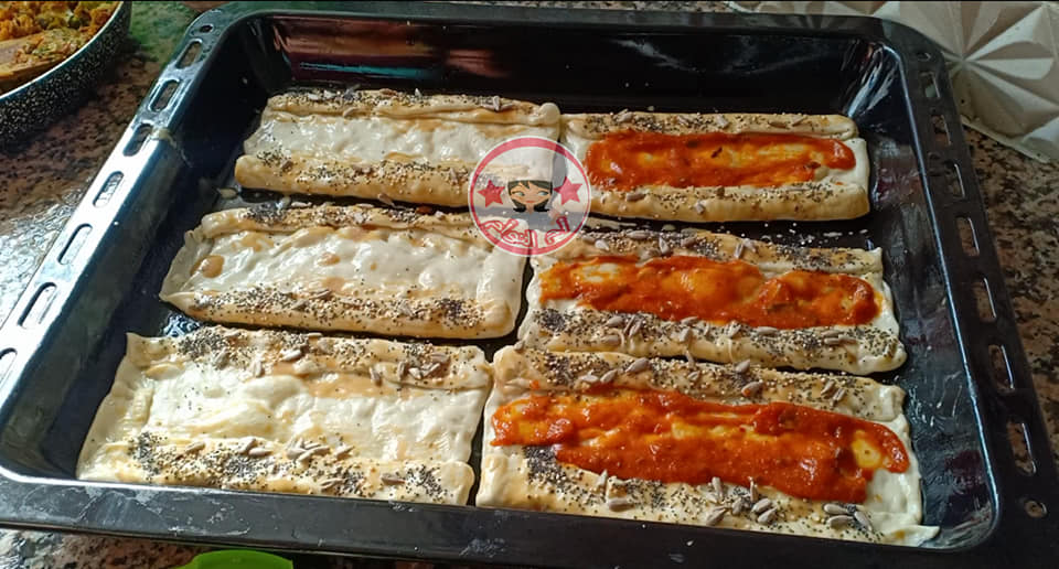 تدهن الفطائر باصفر البيض و ترش الجوانب بالبافو او الزنجلان او حسب الرغبة ثم تدهن بالصلصة