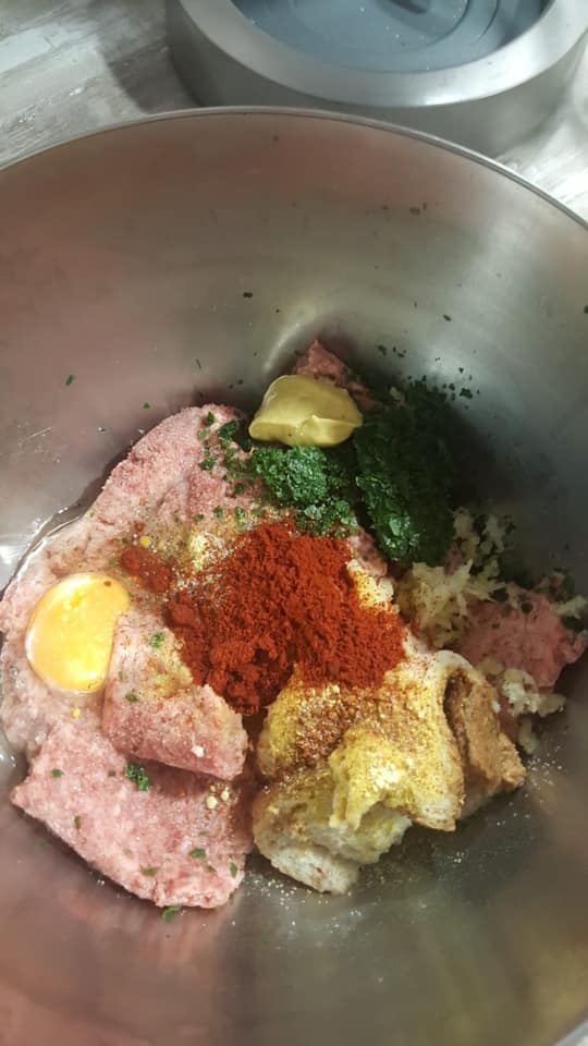 ثم نضيفها للكفتة مع ملعقة صغيرة من الموطارد ممكن اضافة اي صوص تفضلون القزبر و معدنوس و التوابل