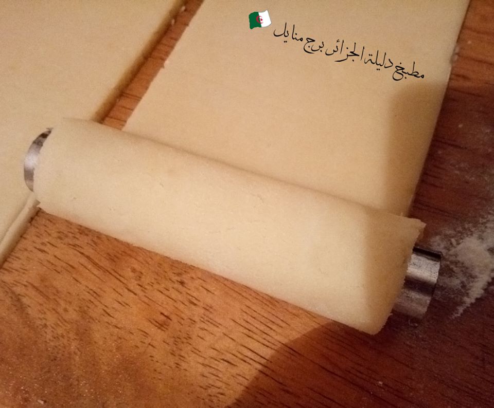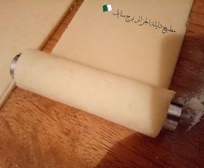 ثم نبسط العجين بالحلال على شكل مستطيل سمك رقيق و العرض يكون على حسب مول سيكار ثم نلف المول بالعجين دورة و نصف و نغلقو جيدا ثم نصففه في صينية و ندخله الفرن مسخن مسبقا على 180 درجة