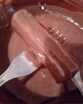نذوب شكولا في حمام مريم ثم نضيف 4 ملاعق زيت و نغطس فيه الحلوة