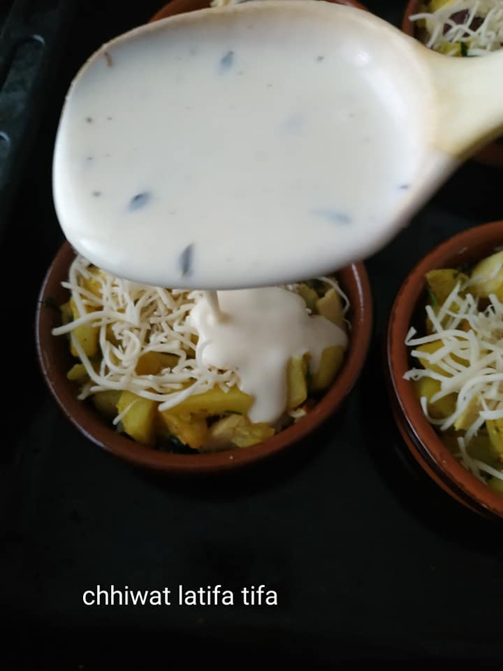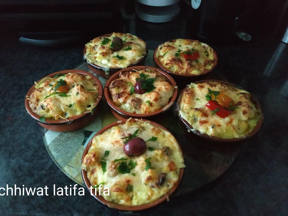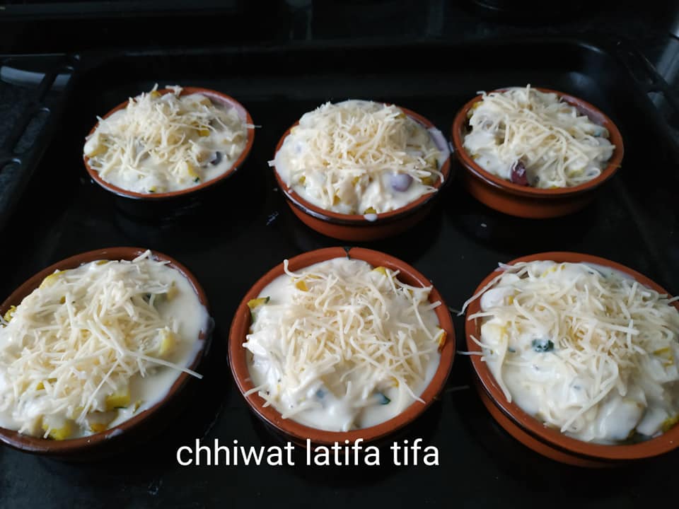 نخلط جميع المكونات ونصبوهوم فالقوالب صغار مدهونين بشوية الزبدة ونصبو عليه صوص بيشاميل والفرماج وندخلوه اتحمر و بالصحة والراحة