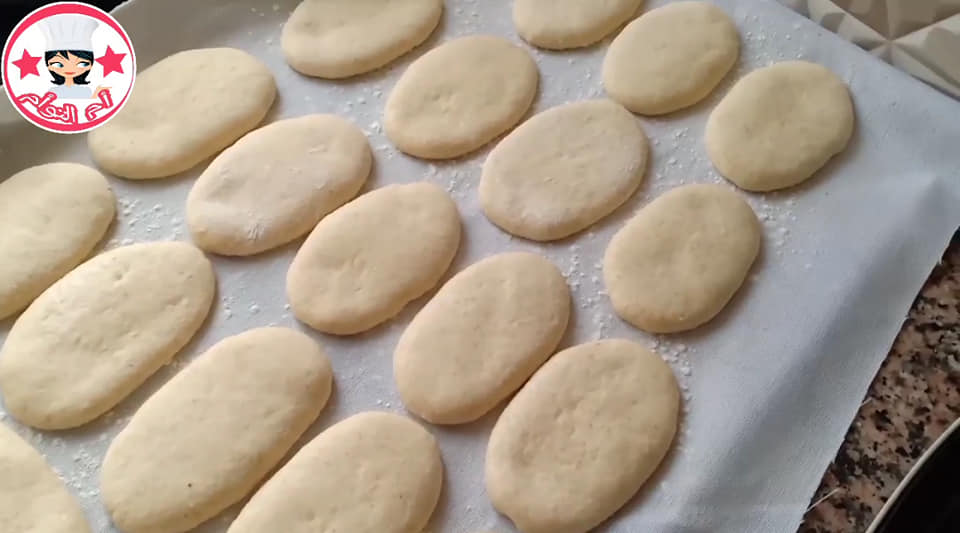 تبسط العجين بشكل بيضوي لا نرقق العجين كثيرا