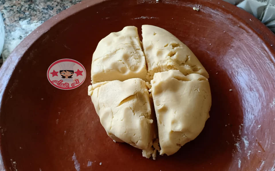 تجمع مكونات العجين حتى تتجانس مع بعض نترك العجين مرخوف شوية و يقسم الى اربع اجزاء