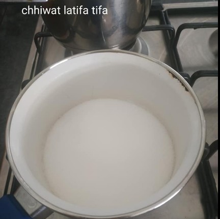 نضع السكر في اناء فوق النار على خفيفة جدا نتركه حتى يتحمر من تحت