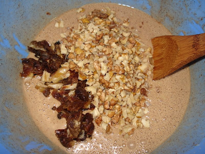 3 البيضات + كاس سنيدة + كاس دقيق ابيض + 2 خميرة الحلوى + ربع كاس زيت + ملعقة كبيرة قرفة + ملعقة صغيرة سكنجبير + كاس كركاع مقطع قطع صغيرة + كاس تمر مقطع قطع صغيرة + 250 غرام شكلاط
