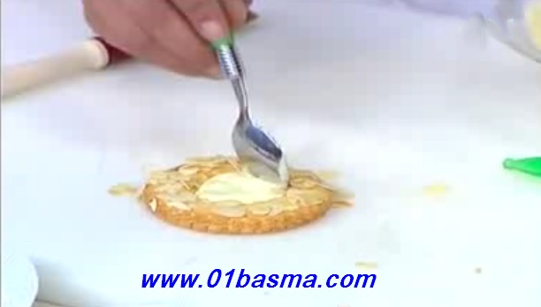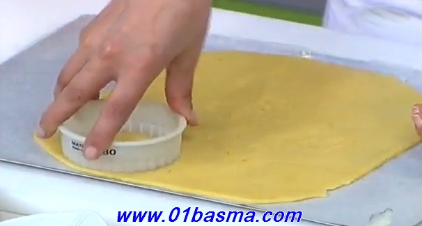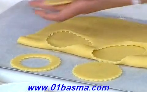 تبسط العجين بالمدلك وتقطع على شكل دائري و على شكل دملج