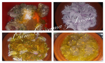 نعمل الزيت فالطاجين منزل على المقلة التقيلة ونزل البصلة مشنفة ونزل عليها اللحم لي شرملت ونغطيه ونخليه يطيب على عافية مهيلة