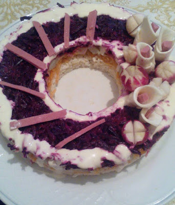 و تزين السلطة بالمايونيز من الجوانب و الفجل على شكل وريدات والفرماج سندويتشات