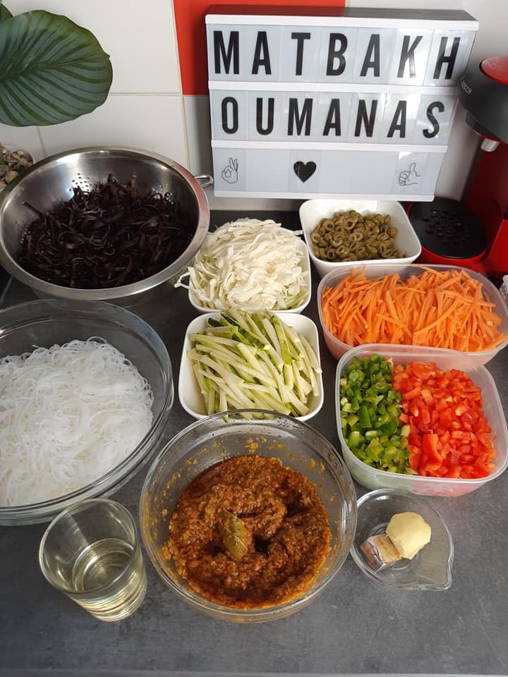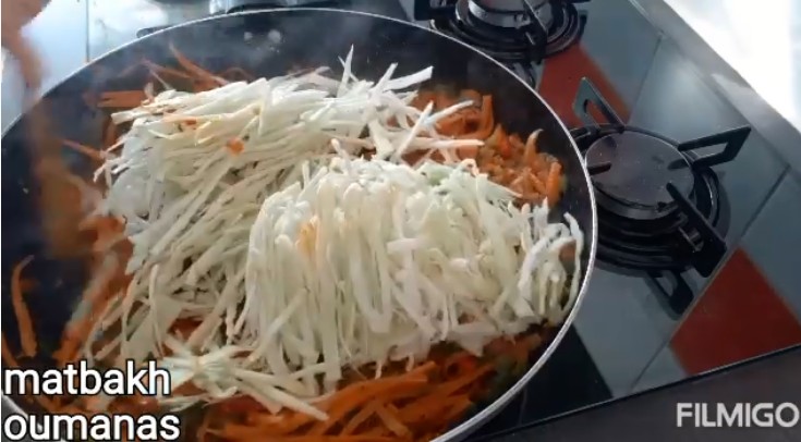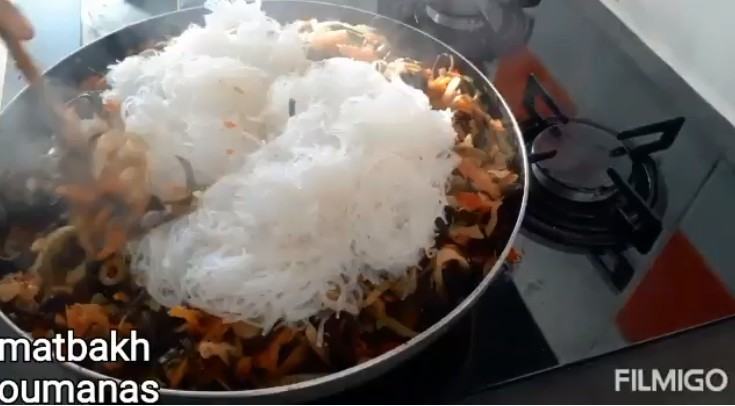 من بعد ما توجد الخضر نضيف لها الشعرية الصينية من بعد ما تديروها فالماء الساخن و نصفيوها و نقطعوها بالمقص نخلط كلي و ها الخضر المرافقة للحوتة فالفران واجدة