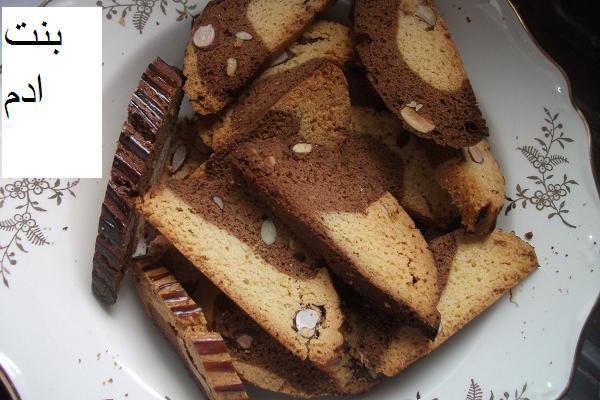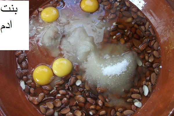 يخدم البيض مع سنيدة تم الزيت لوز وخمارات مع اضافة الدقيق شوية بشوية ختى تجمع العجين و نحصل على كورة من لعجين تقسم على 2 كورة تترك هكاك وكورة يضاف لها الكاكاو