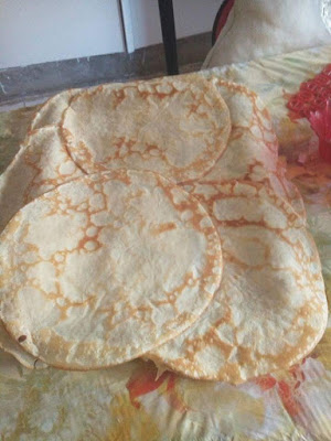 ثم نبسط العجين و يكون رقيق جدا و نضع الحشوة في الوسط