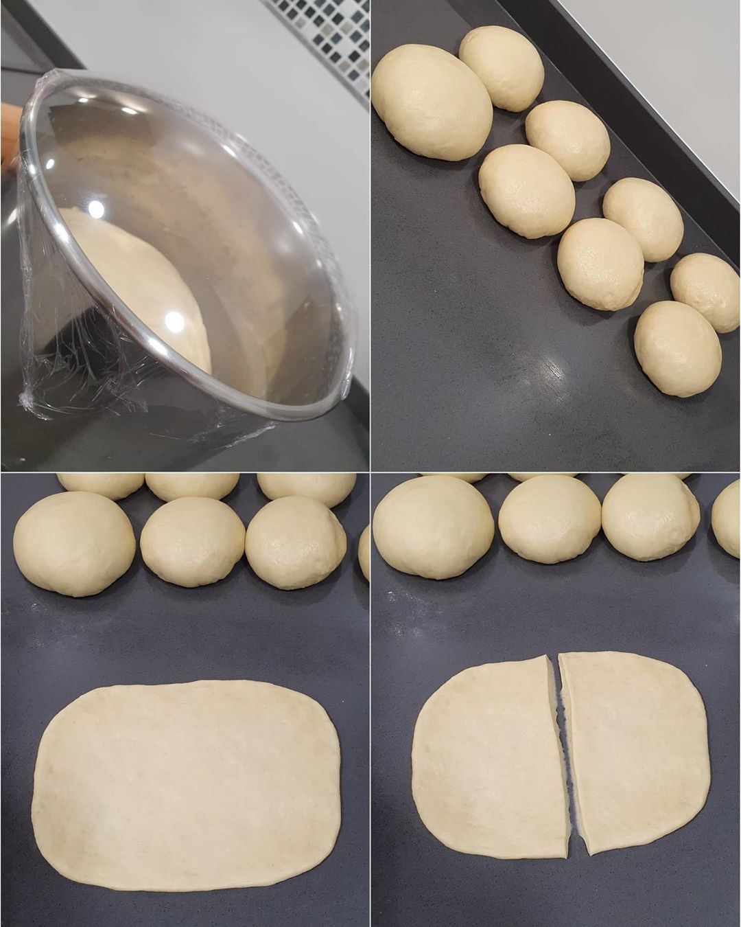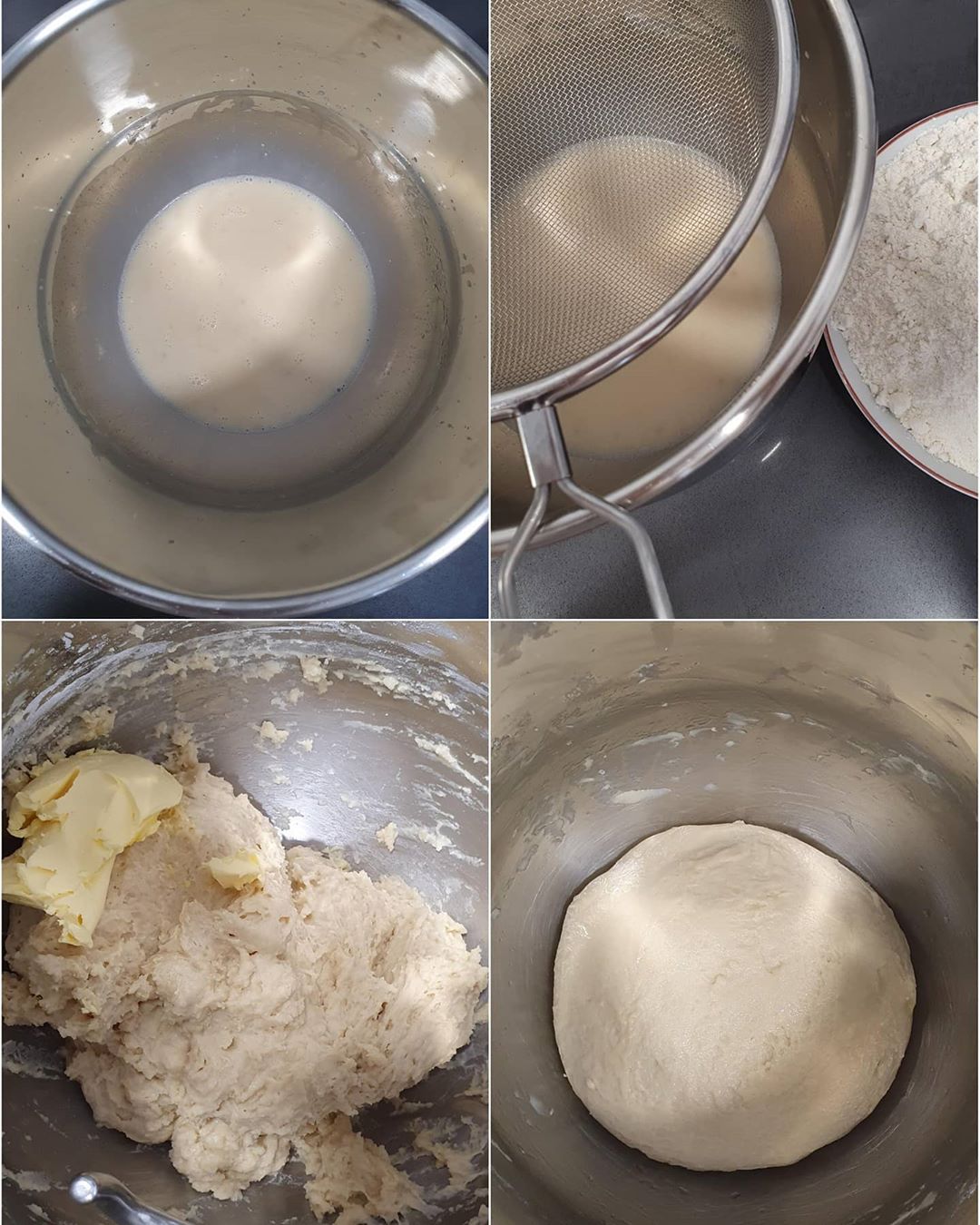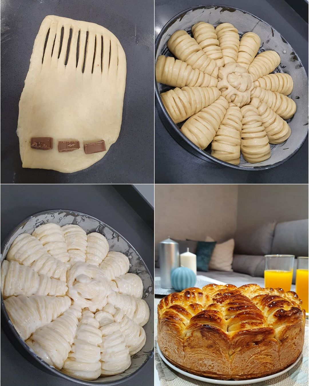 ملي نعجنو العجينة نخليوها حتى تخمر مزيان و يتضاعف الحجم ديالها نشكلوها كما هو موضح في الصور ونخليوها حتى توصل نصف الإختمار و ندهنوها باليوغورت و نخليوها تكمل الإختمار عاد ندخلوها الفرن مسخن على درجة حرارة هادئة ( نفس الدرجة لي كطيبو عليها الكيك )