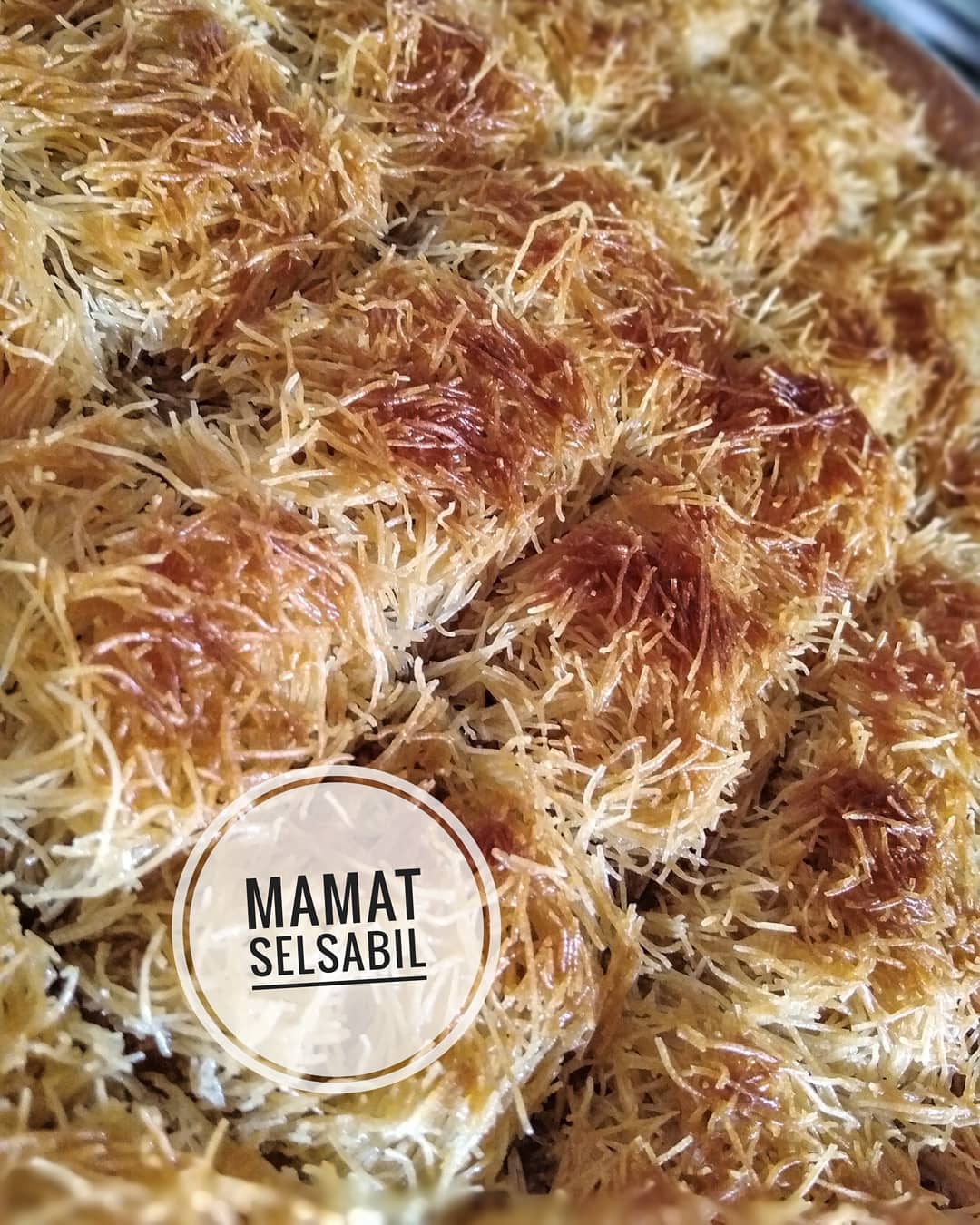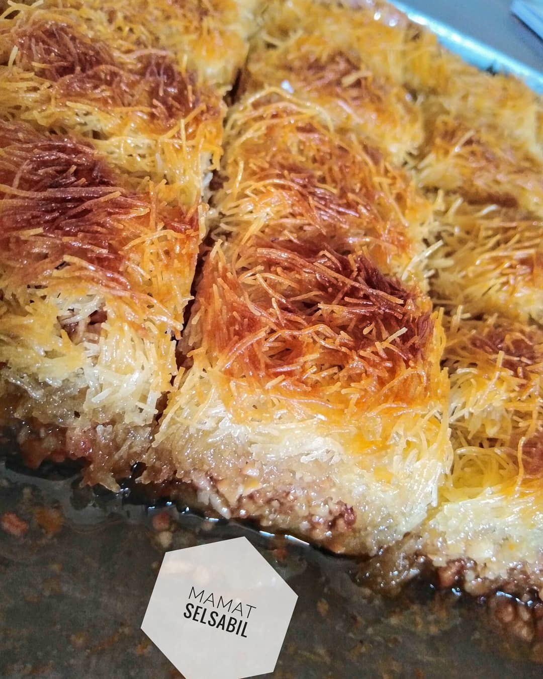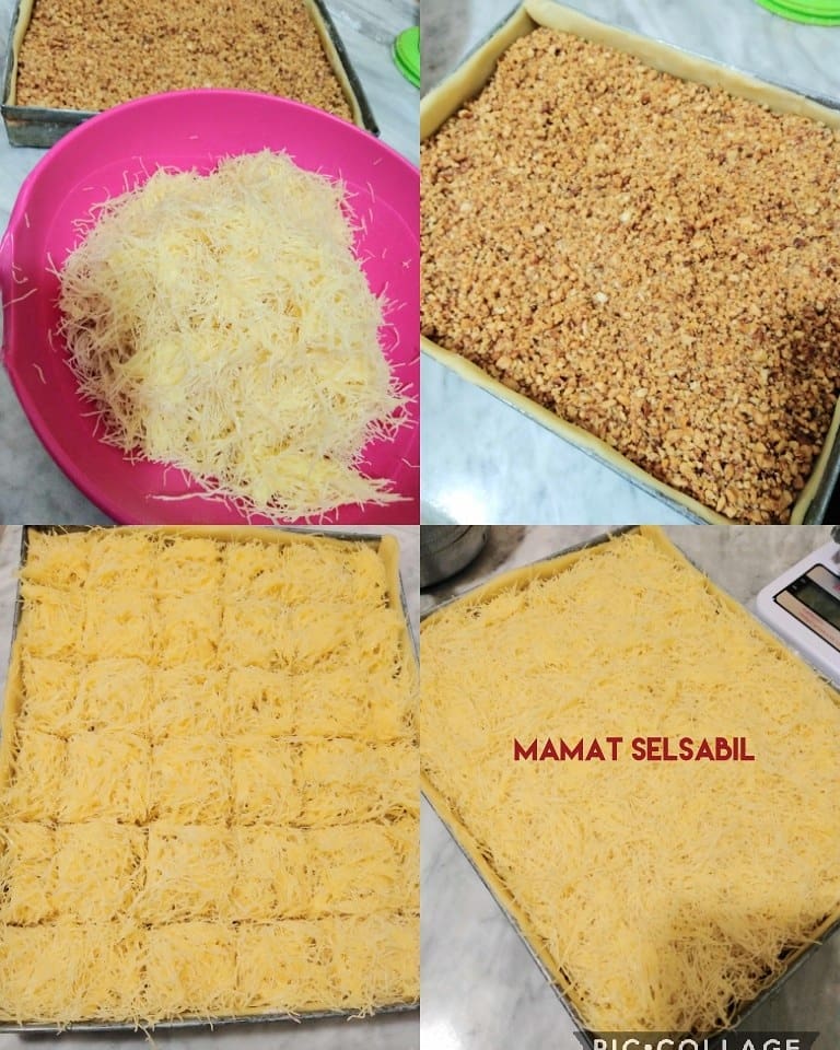 من جهة أخرى نذوب 100 غ مارغارين + 100 غ سمن نتركه يبرد قليلا ونحضر القطايف اي الكنافة نحاول نحلها ونقطعها قليلا باليد وندهنها مليح بالسمن والزبدة ثم نغطي الحشو ونعمل طبقة لابأس بها ونعود نذوب 100 غ مارغارين + 100 غ سمن وندهن القطايف من فوق جيدا بواسطة فرشاة ونقطعها بالسكين وندخلها اطيب في فرن مسخن مسبقا على درجة أقل من المتوسط لما بتحمرو الجوانب نشعل عليها من فوق حتى تتحمر ونعسها لانها تتحمر خفيف ومباشرة لما نخرجها نعسلها (العسل تقريبا نفس مقدار المكسرات)