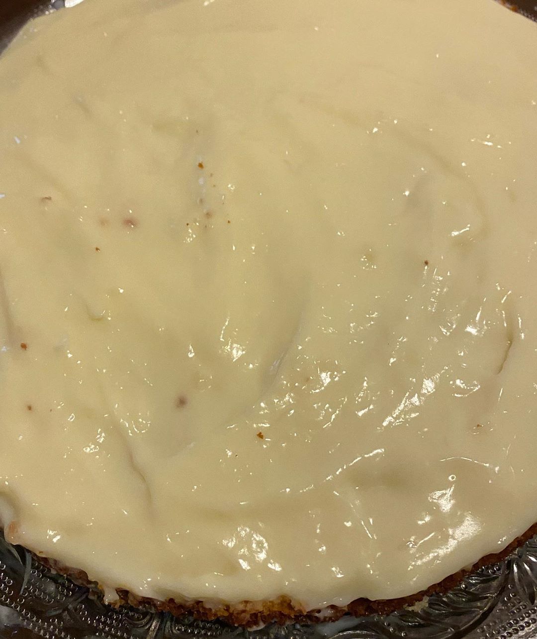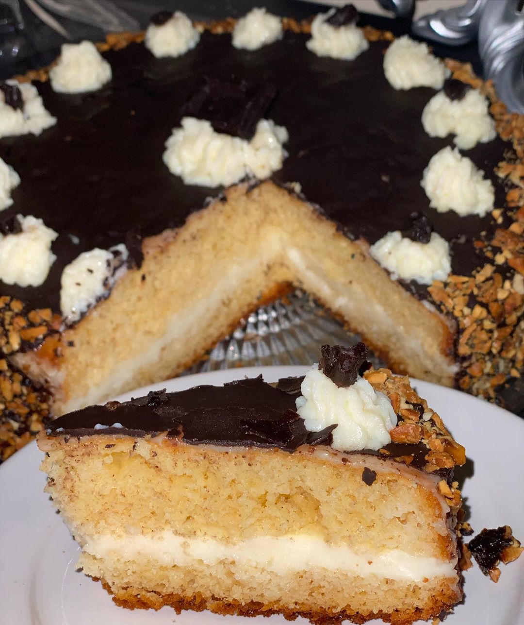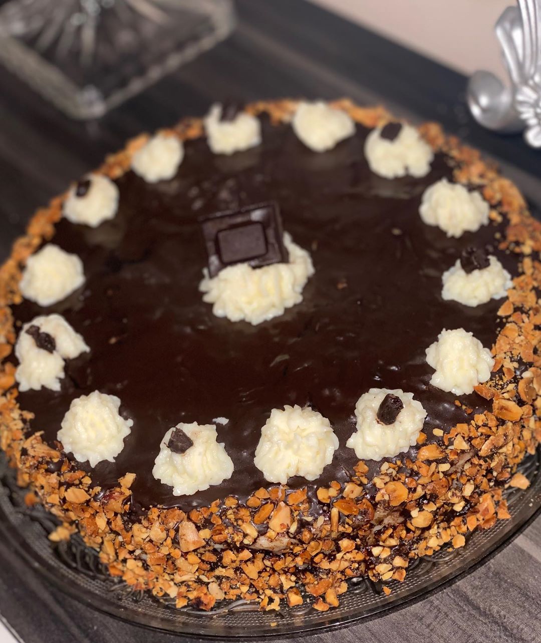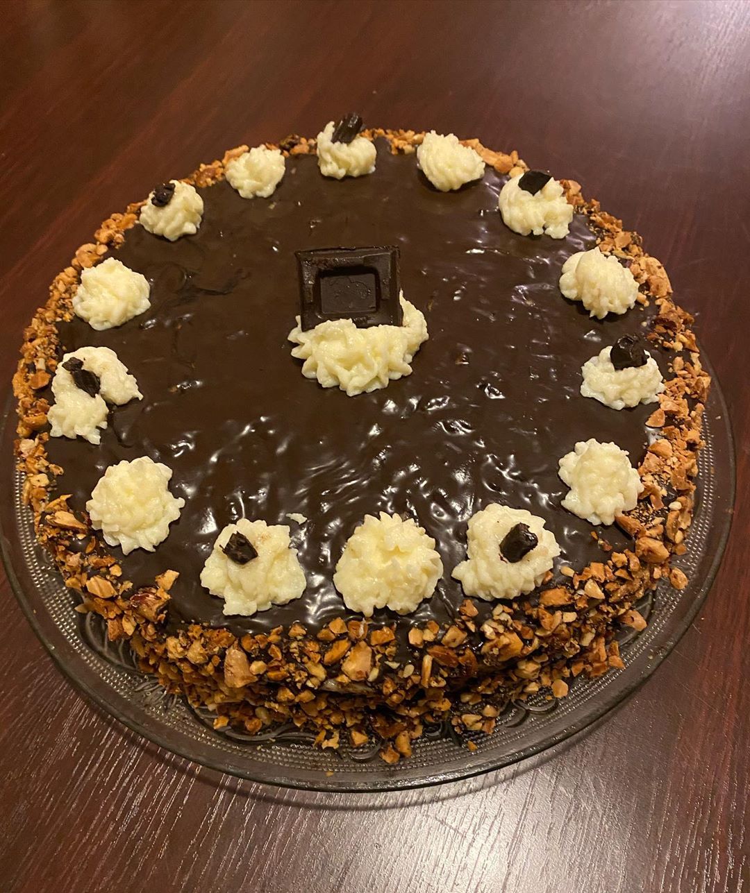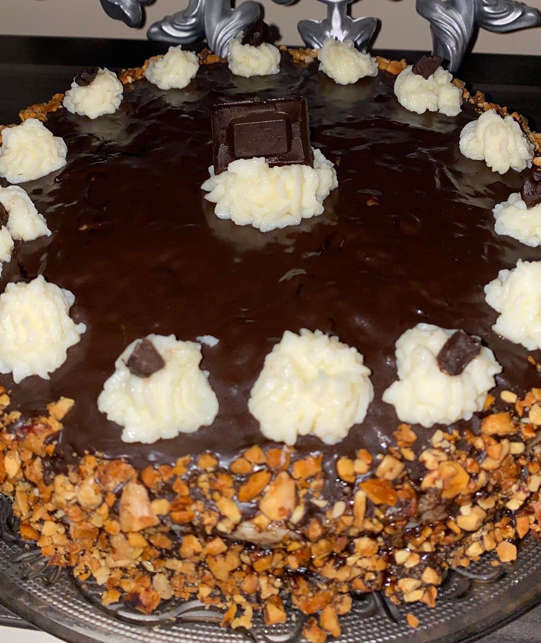 من بعد كندهنا بالكريم باتسيير وكندهن الطرطة كاملة بالشكلاط اسود مذوب وكنرش الجوانب بالكاوكاو مهرمش