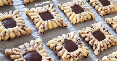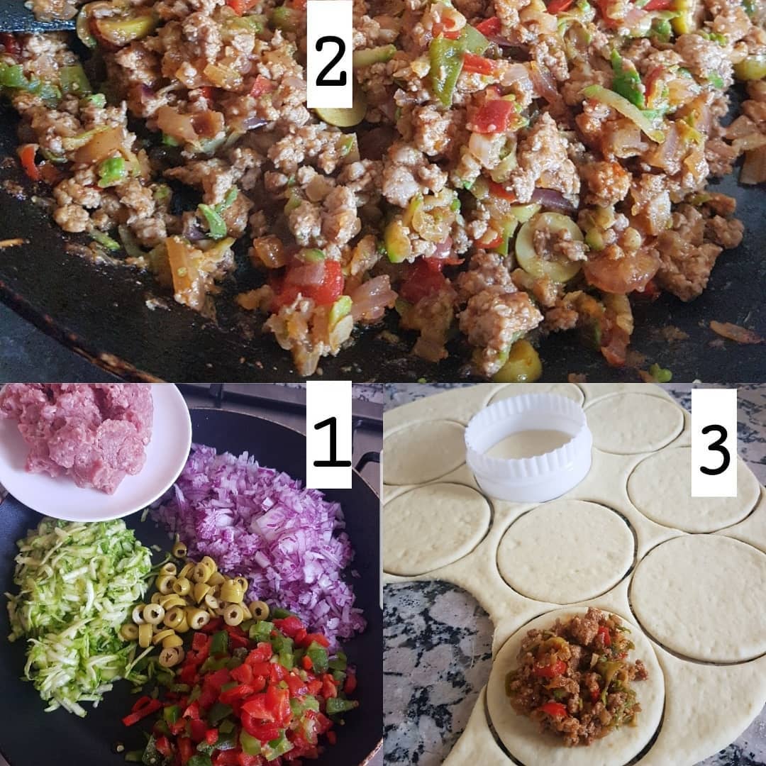 نأخذ العجين ندلكها ونقطع دوائر ونعمر كل واحدة بالحشوة نكثروها شوي وكنسدها بحال الكموسة