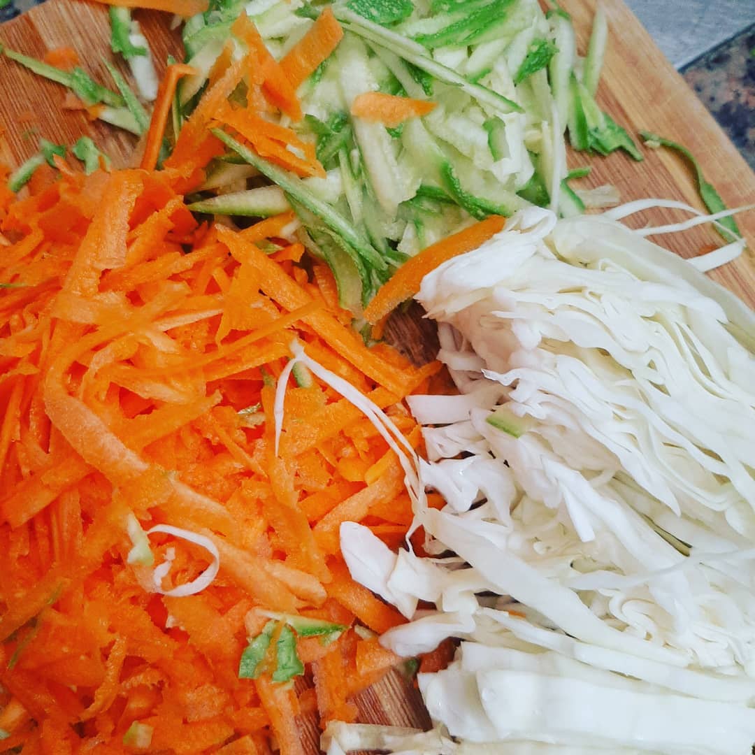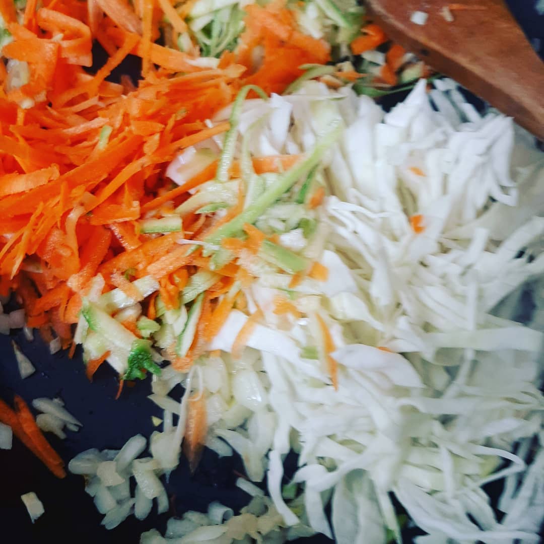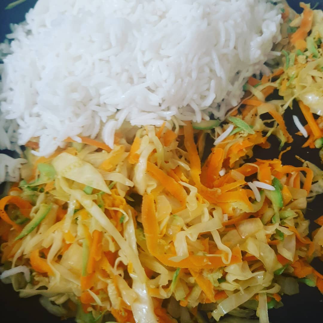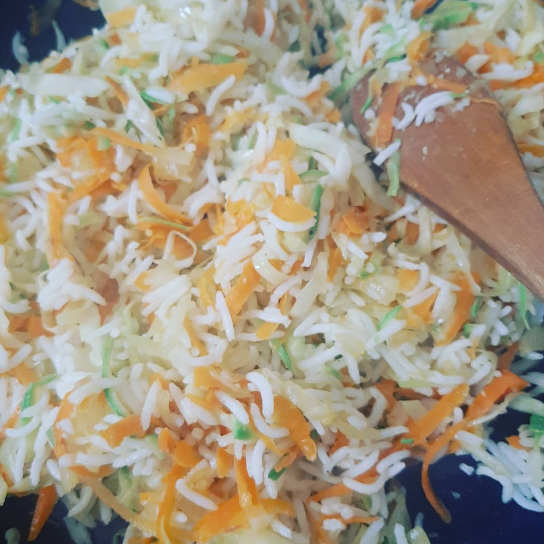 تم نضيف الجزر والقرع الاخضر والملفوف ونضيف قليل من الابزار والملح الكافي نضع غطاء فوق الاناء حتى تطهى الخضر جيدا تم نضيف الارز يمكننا اضافة الطون المعلب 😘😘😘