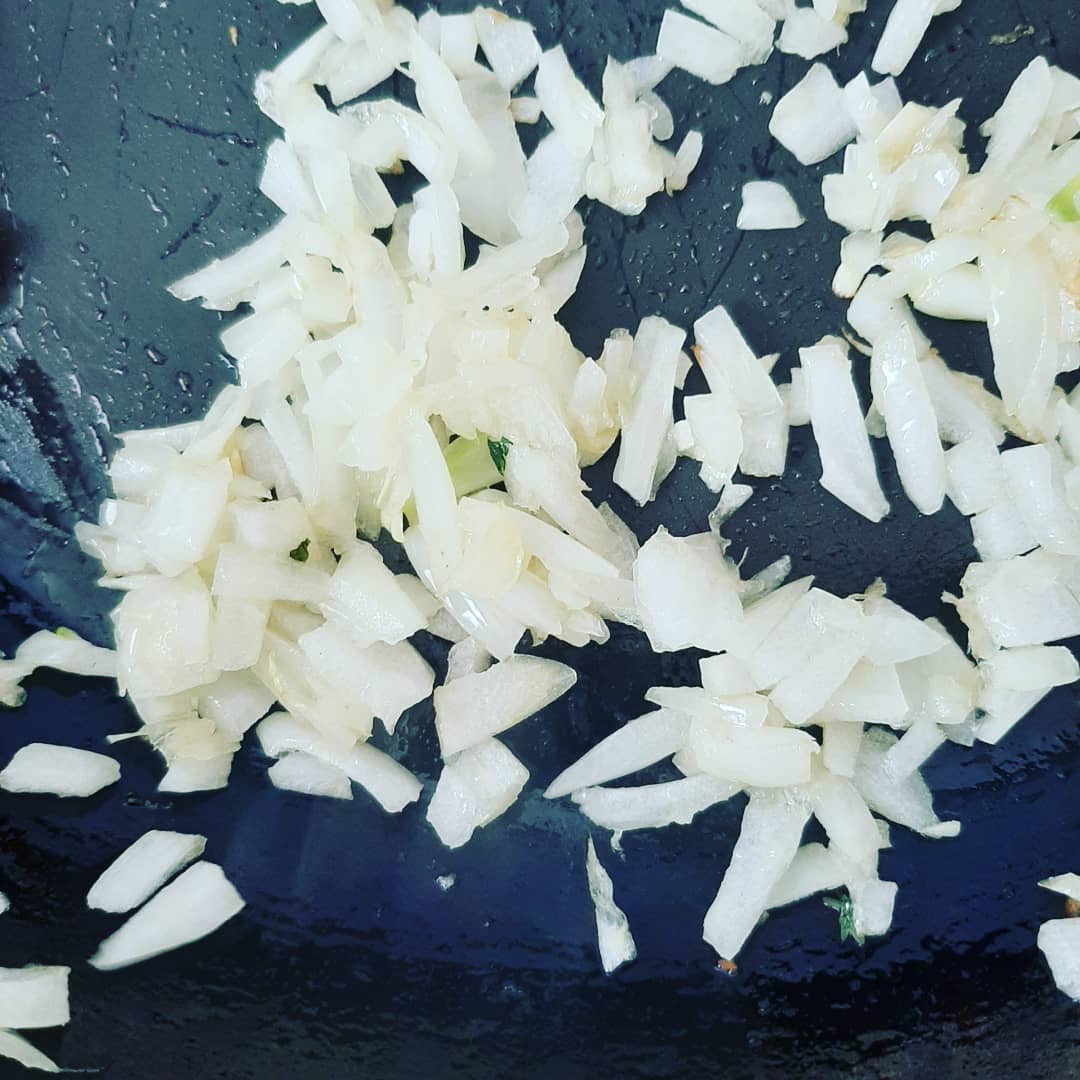 ناخد مقلاة اضع فيها زيت الزيتون بصل مقطع قطع صغيرة وملح