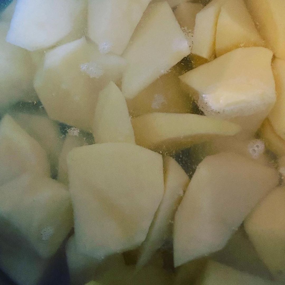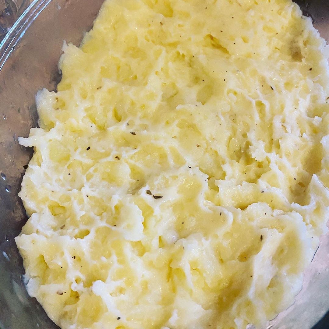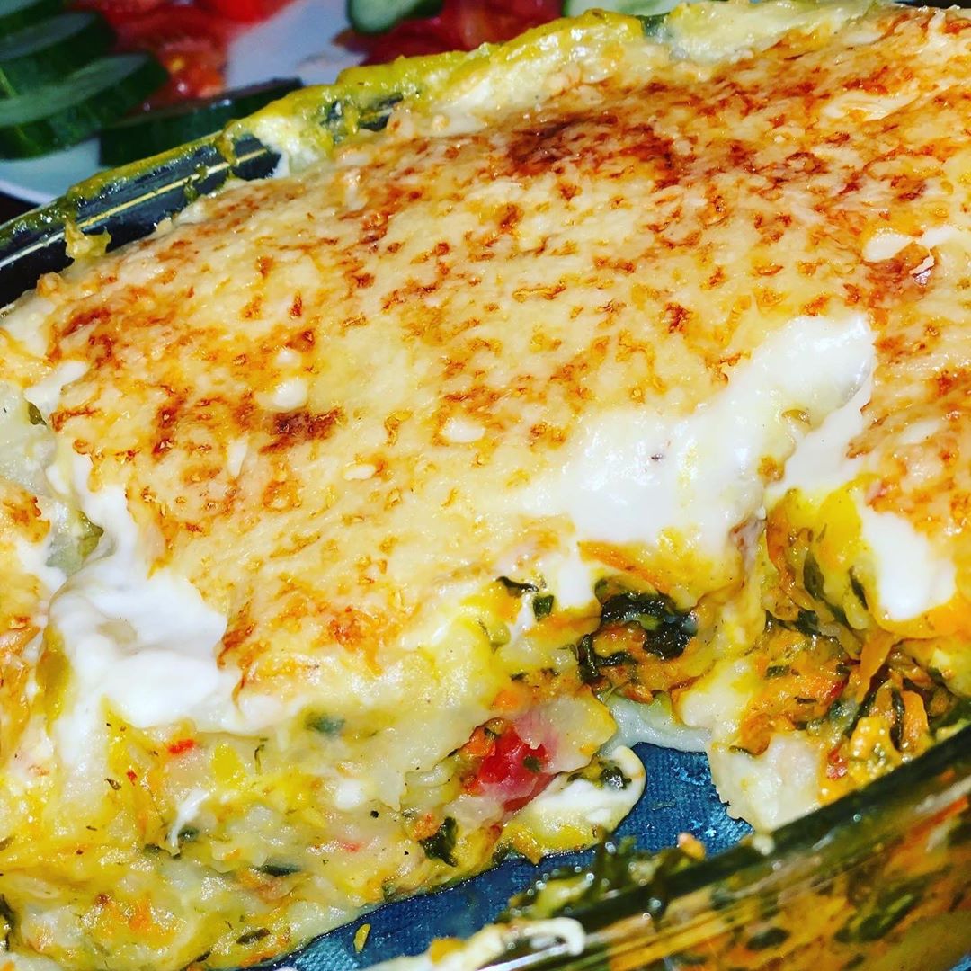 ملي كتطيب كنصفيها و نعجنا بالشوكة ولا الملعقة الي كتعجن البطاطا من بعد كنزيدلا ملعقة دالزبدة وشوية دالابزار وشوية دالزعتر وكنخلط وكنعمل نصف الكمية في القالب د الكراتان وكنعمل الحشوة دالخضر