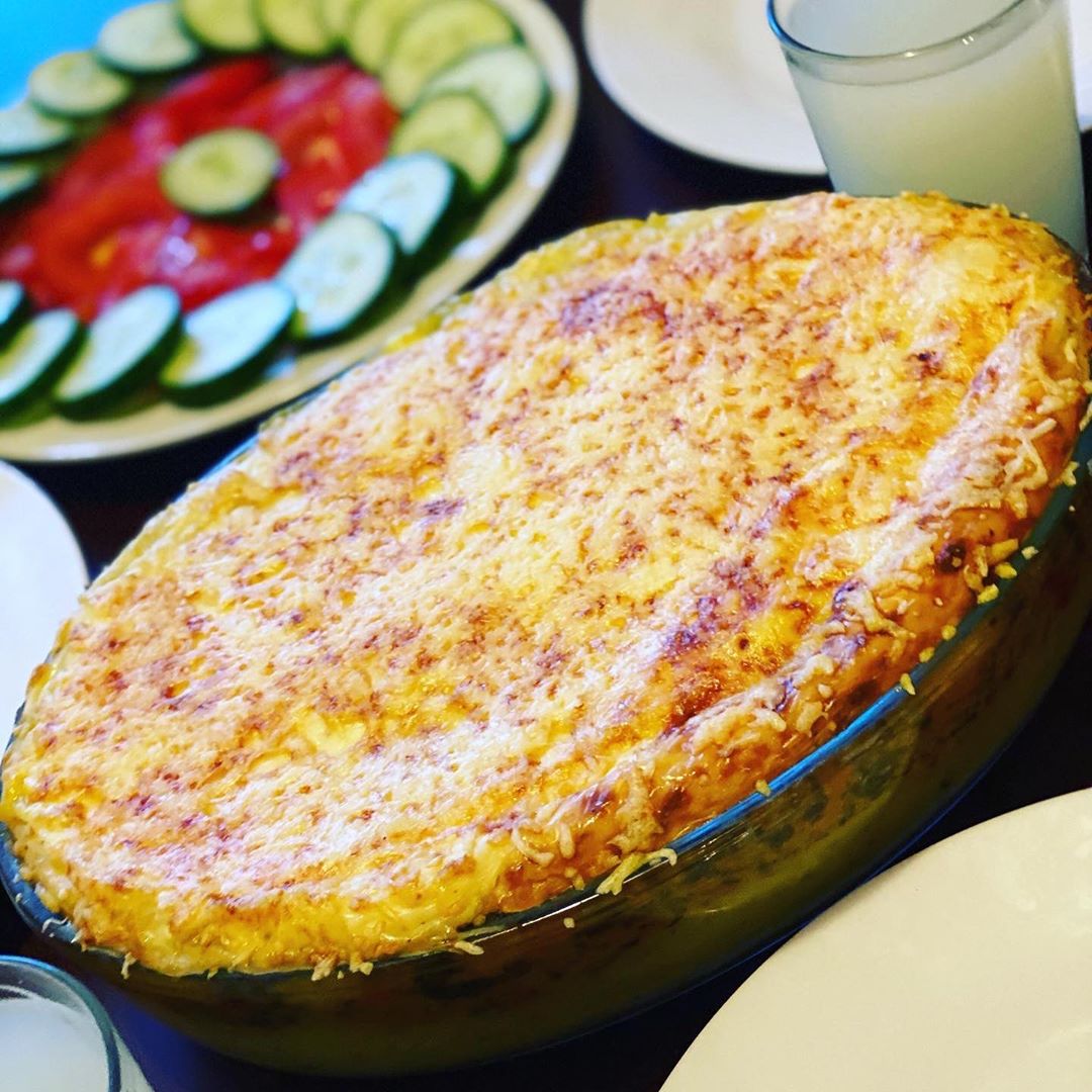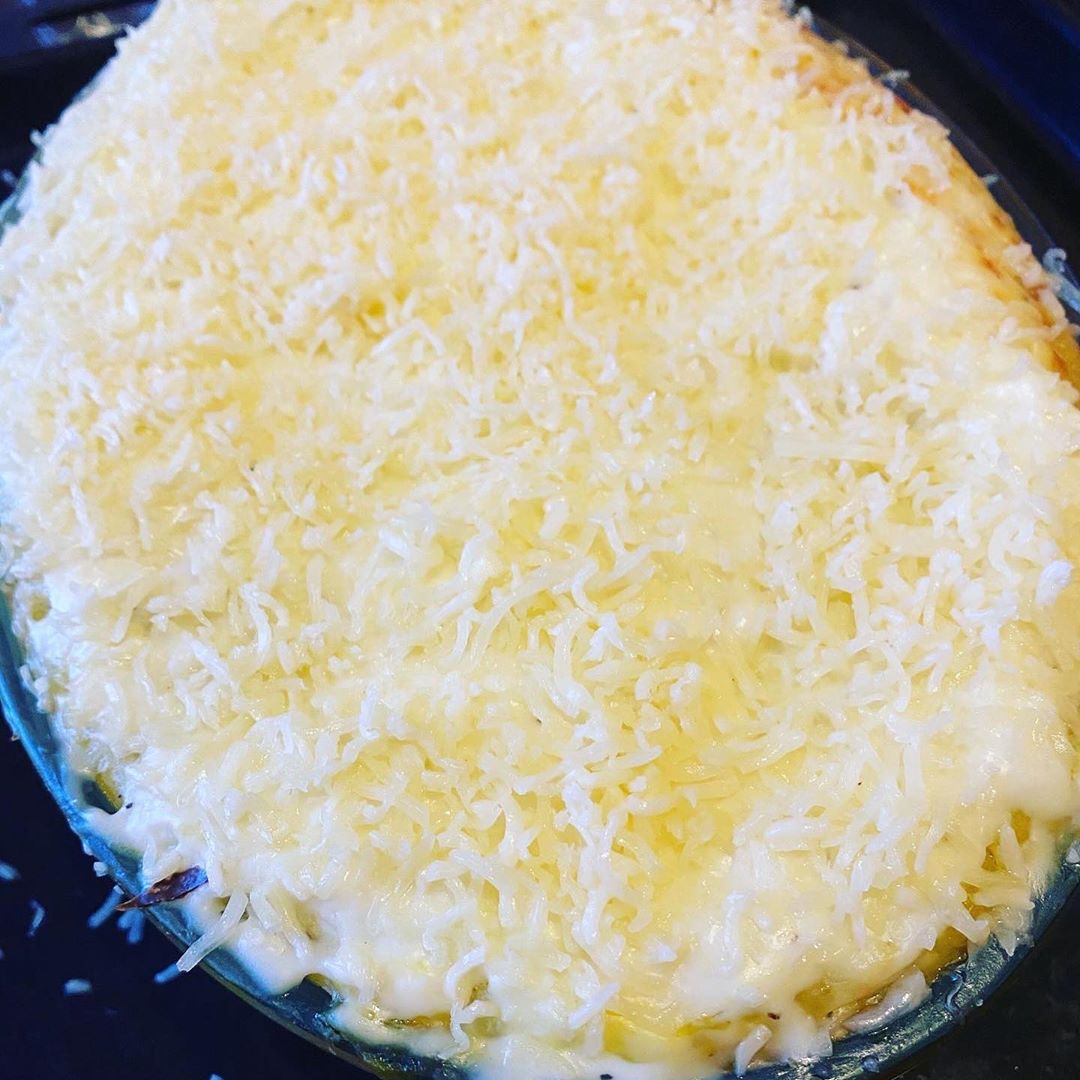 من بعد كنزيد الكمية دالبطاطس الي بقات من فوق وكنعمل من الفوق البيشاميل والجبن المحكوك وكندخلا نالفرن حتى يتحمر الجبن.