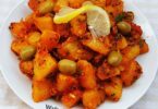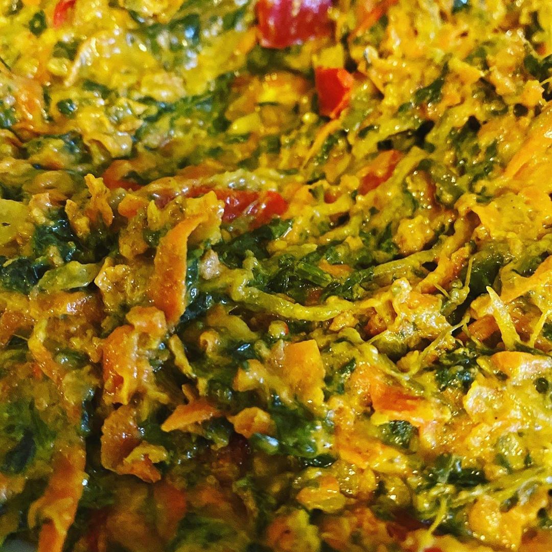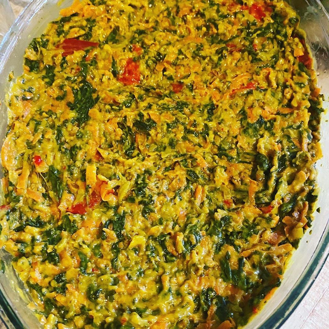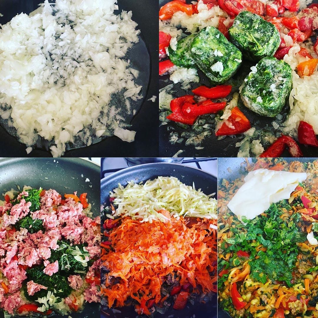 بصلة مشلضة كنقليها في شوية دالزيت وكنزيدلا فلفل احمر مقطع والسبانخ مقطعين ولا مثلجة وشوية دالملح كنخليهم شوية من بعد كنزيد الكفتة ملي كتقلى شوية كنزيد القرع محكوك والجزر محكوك وشوية ابزار خرقوم سكنجبير وشوية د المعدنوس مقطع ملي كيطيب كلشي كنزيدلا شوية دالجبن محكوك او الجبن مربع ملي كيدوب الجبن كنطفي عليها النار .