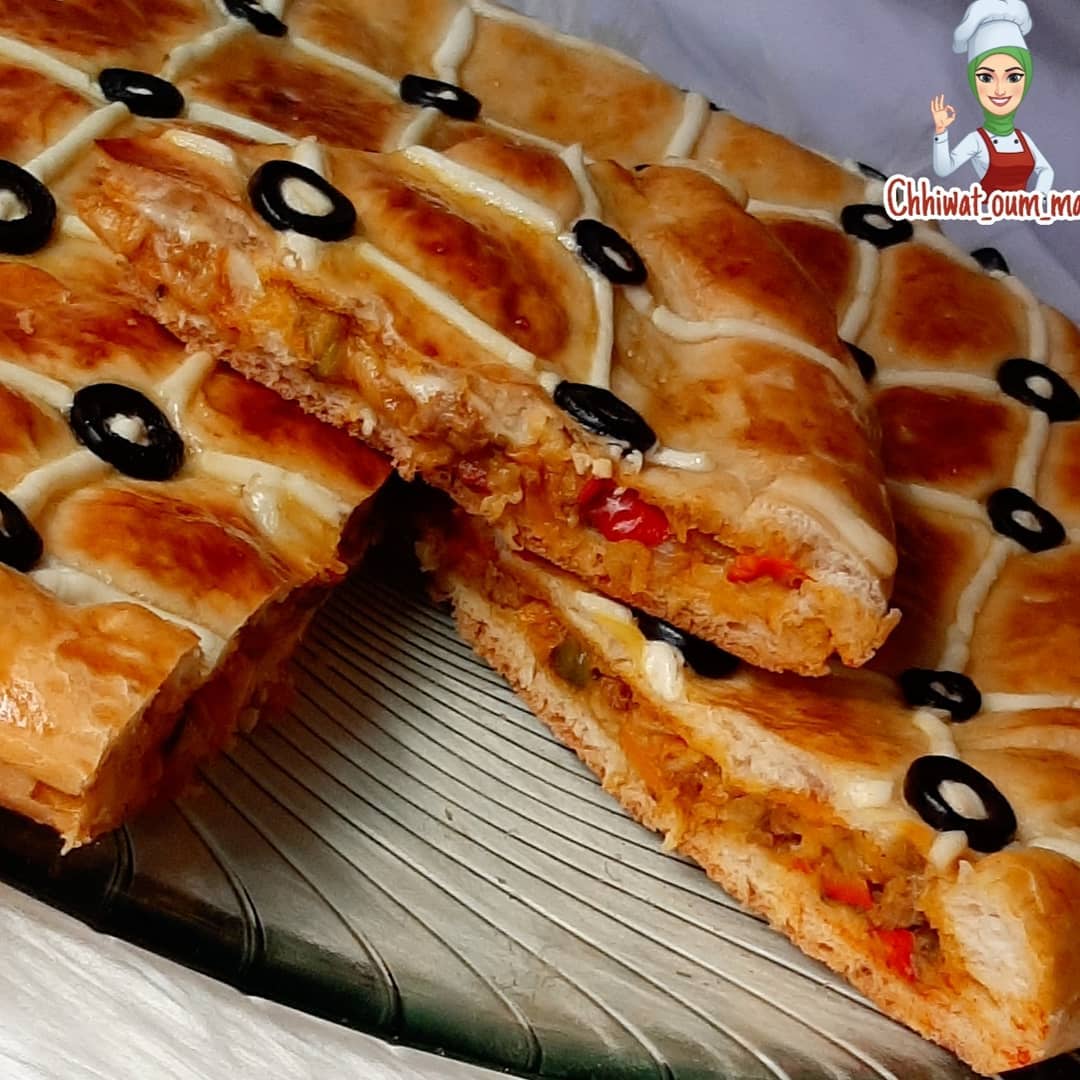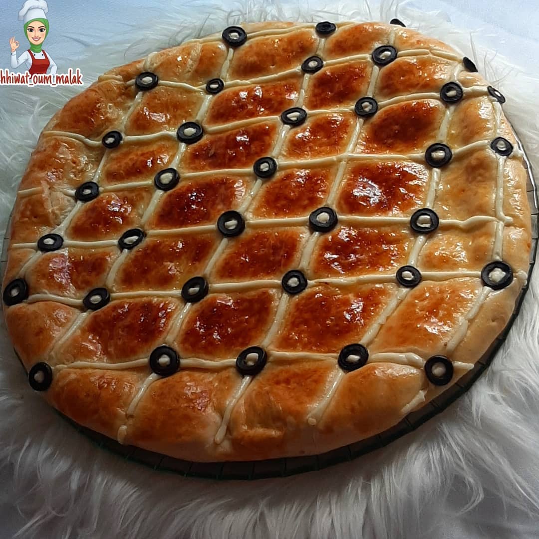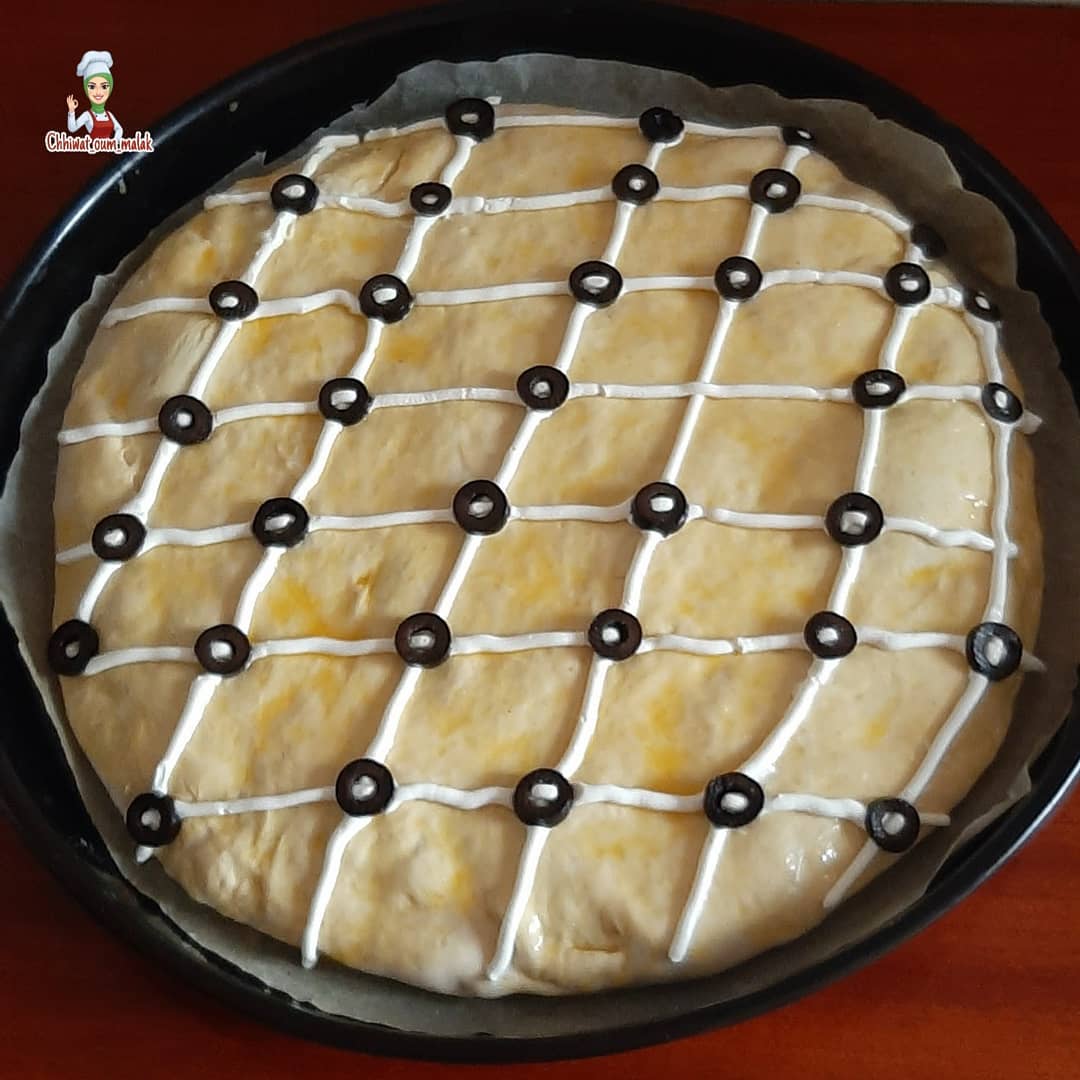 نسرح العجينة و نضع فوقها الحشوة ثم نضيف الجبن سندويش و نطلق العجينة الثانية و نضعها فوق الحشوة و ندهن الفطيرة ببيضة و قليل من الحليب و نزينها بالجبن الكريمي و الزيتون الاسود و ندخلها الفرن المسخن على درجة حرارة °180 .