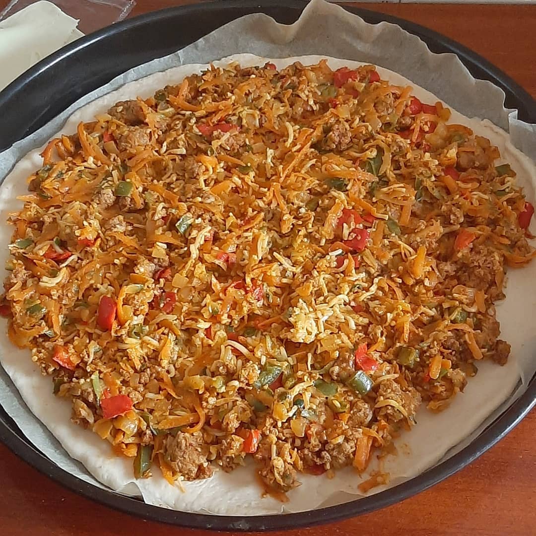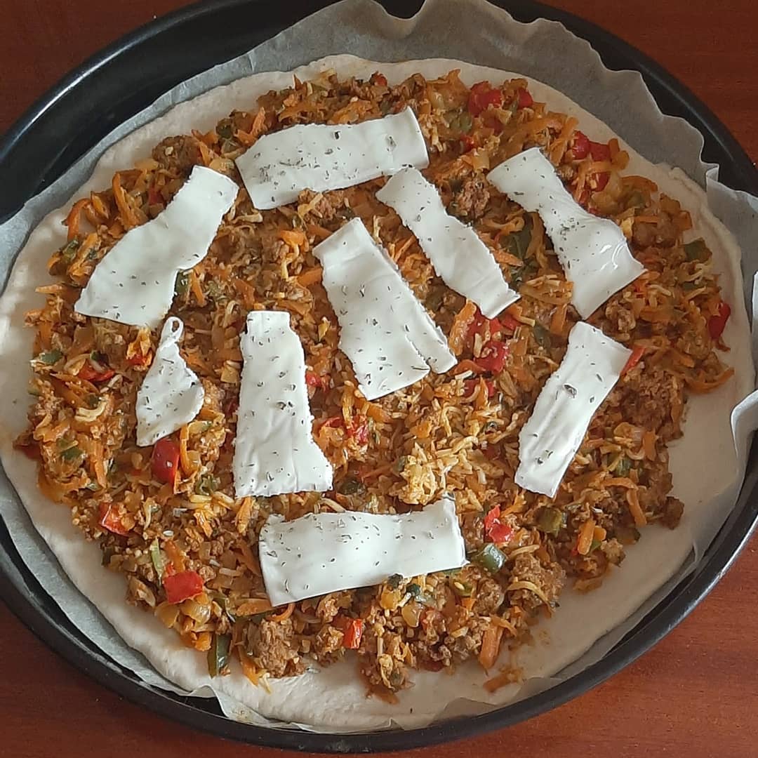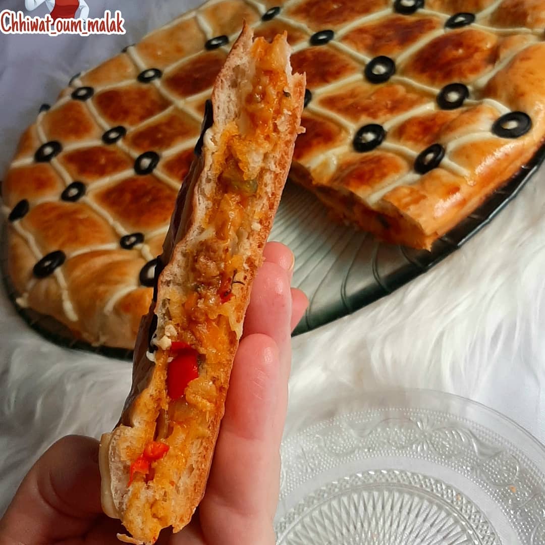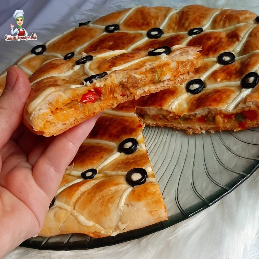 نسرح العجينة و نضع فوقها الحشوة ثم نضيف الجبن سندويش و نطلق العجينة الثانية و نضعها فوق الحشوة و ندهن الفطيرة ببيضة و قليل من الحليب و نزينها بالجبن الكريمي و الزيتون الاسود و ندخلها الفرن المسخن على درجة حرارة °180 .
