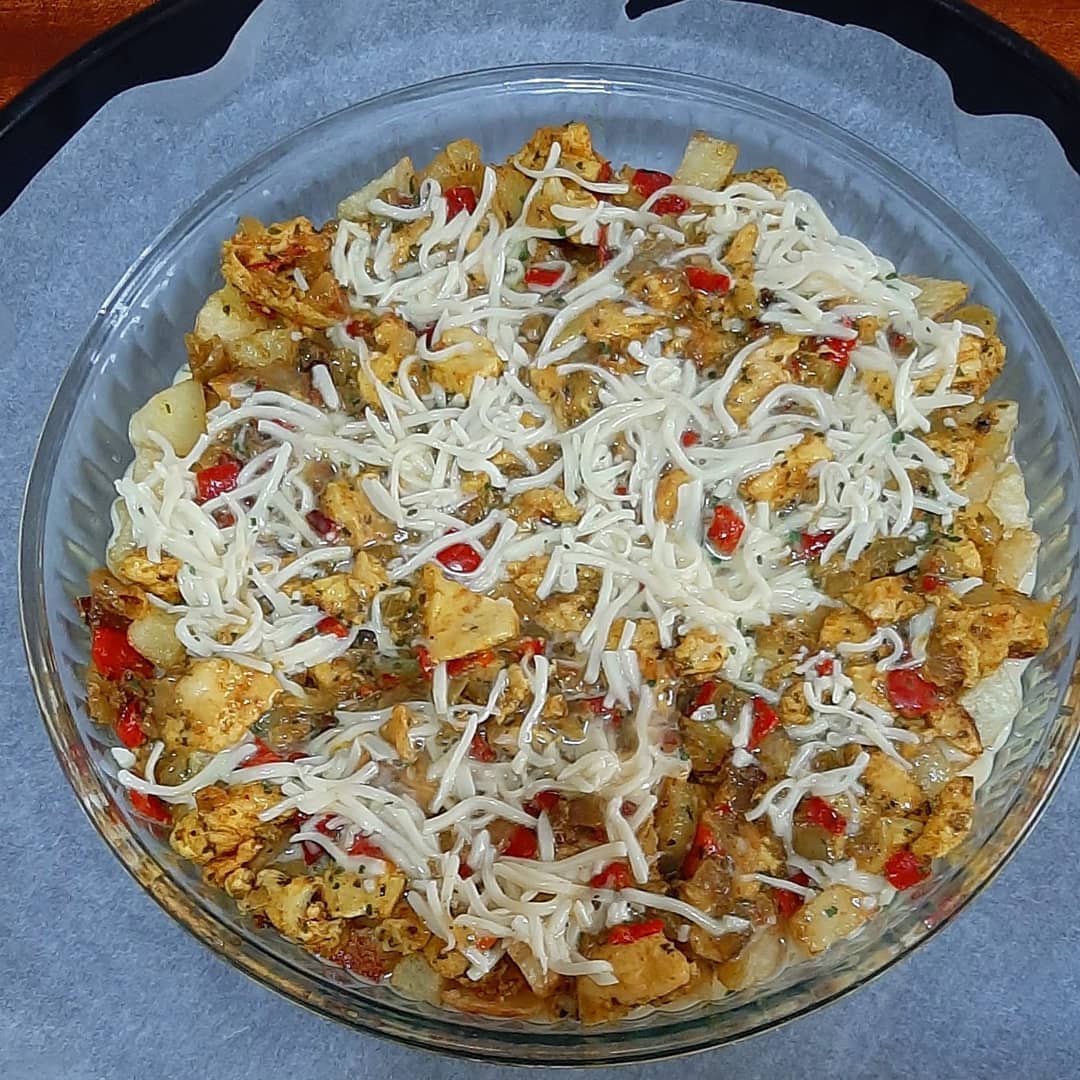 في صنية الفرن ندهنها بقليل من الزبدة ثم نضع طبقة البطاطس و نضع فوقها طبقة الدجاج و البيض ثم نضيف قليل من الجبن و الزعتر ندخلها الفرن ساخن لمدة 15 دقيقة