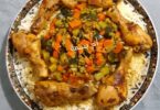 4حبات بطاطس مقطعة طريفات صغار و مقلية_صدر دجاج مقطع طريفات صغار_بصل مفرومة_فلافل مقطعى طريفات صغار _معدنوس_توابيل الدجاج_فلفل اسود_خرقوم سكنجبير ملح
