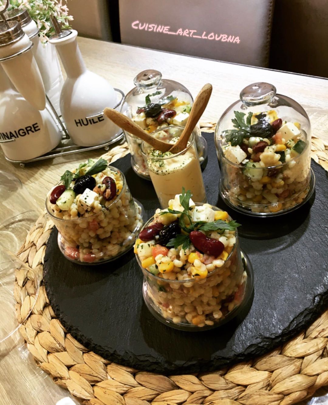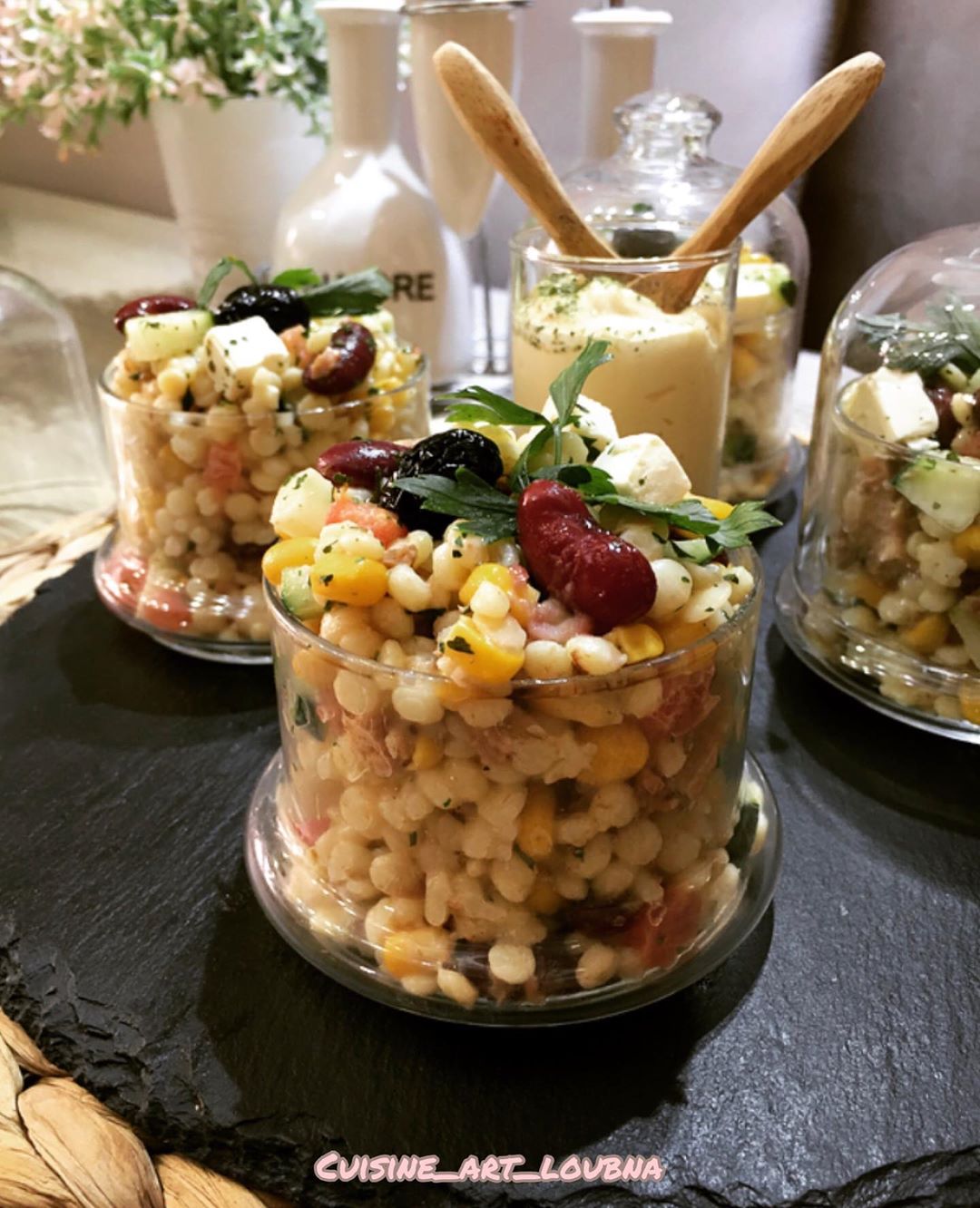 كنخلطو المكونات كلها ونعملوها فكاسات التقديم ونزينوها بالبقدونس او الحبق ونرش رشة اعشاب ونقدموها مع صلصة المايونيز الخاص بالسلطة وبالصحة والراااحة👌👌