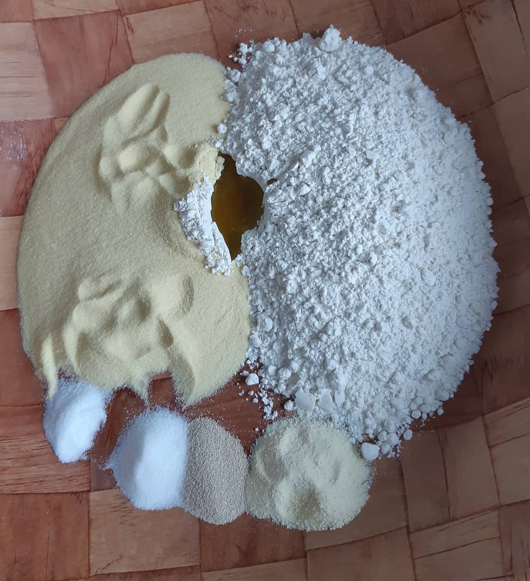 في إناء نضع كل المكونات ثم نضيف الماء الدافئ حتى نحصل على عجين لين مثل عجين الخبز ونتركه يختمر ويتضاعف حجمه