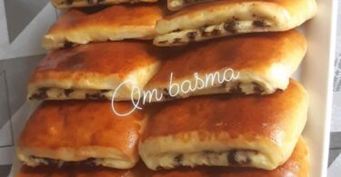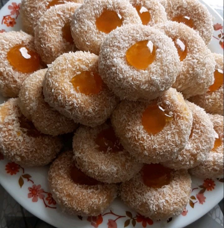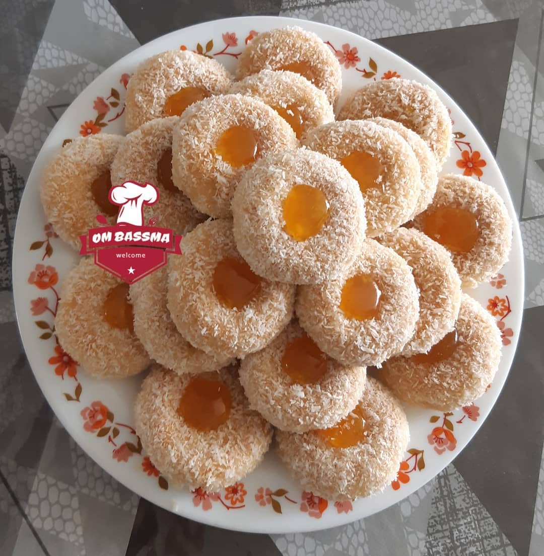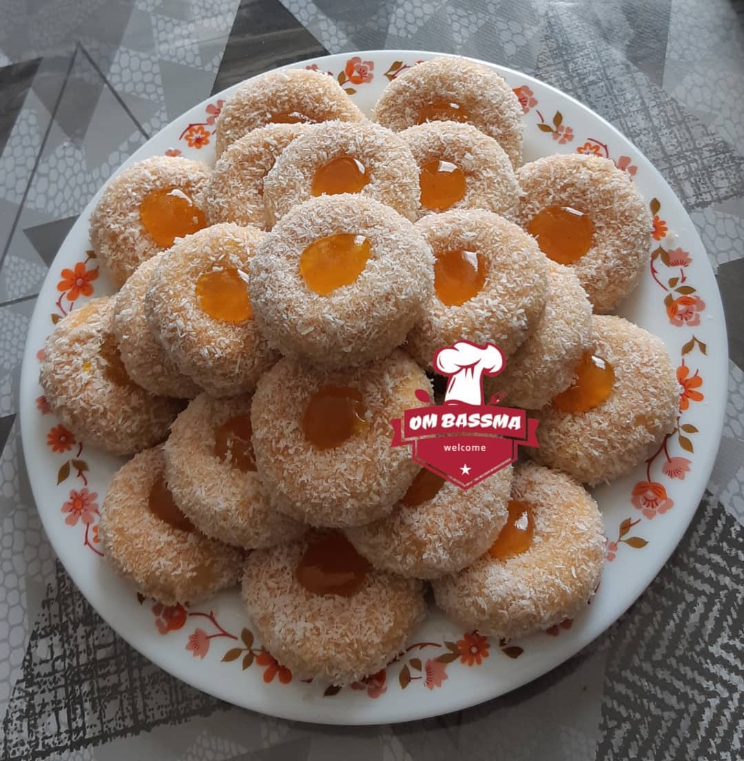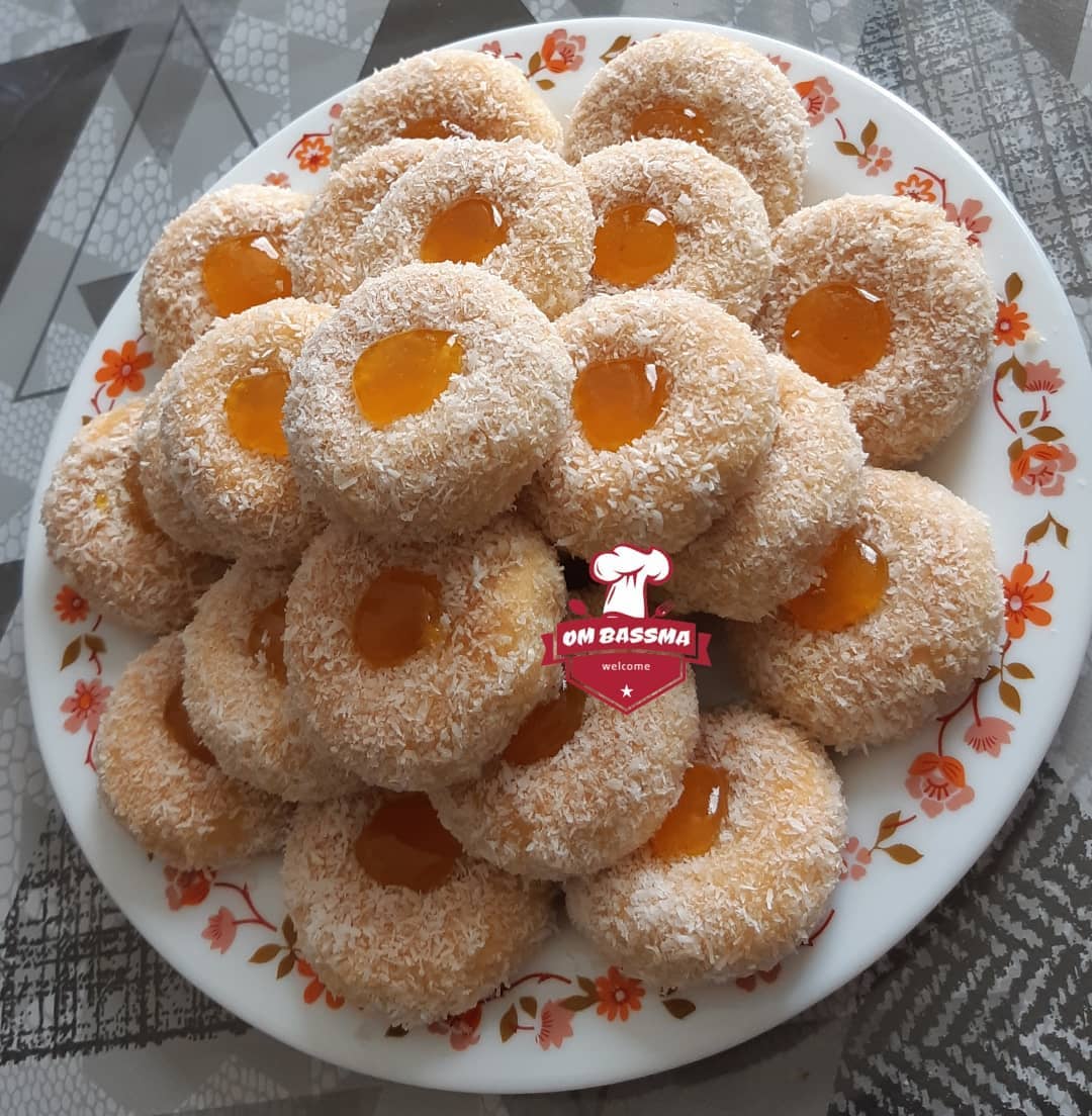 نشكل من العجين كويرات صغيرة ونضعها في صينية الفرن مفروشة بورق الطبخ ثم نقوم بثقب الكويرات من الوسط بواسطة أصبع وندخلها الى الفرن حتى تتحمر