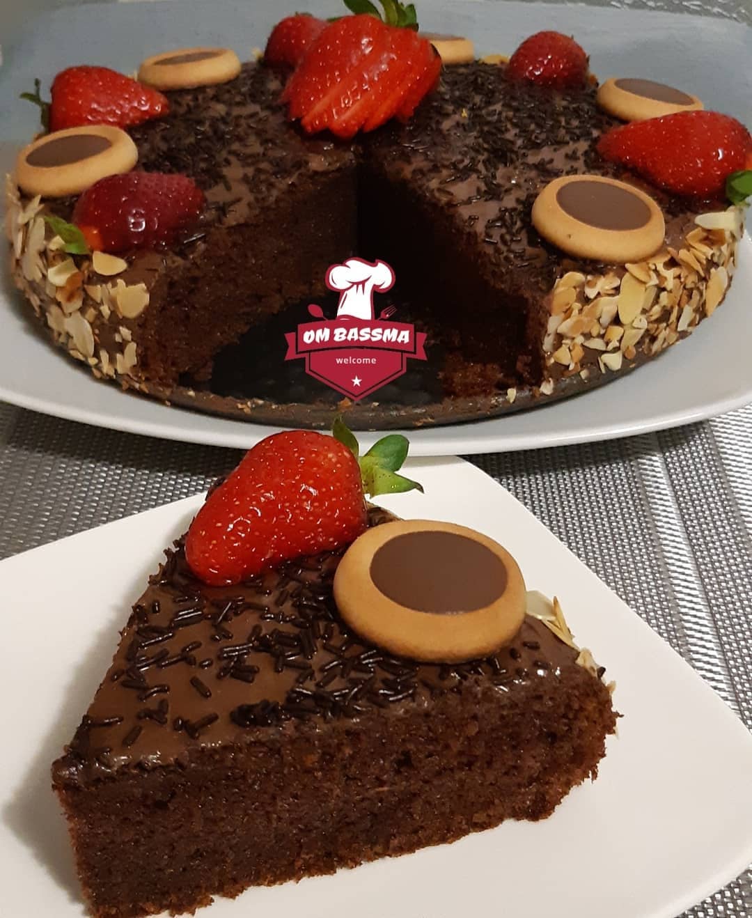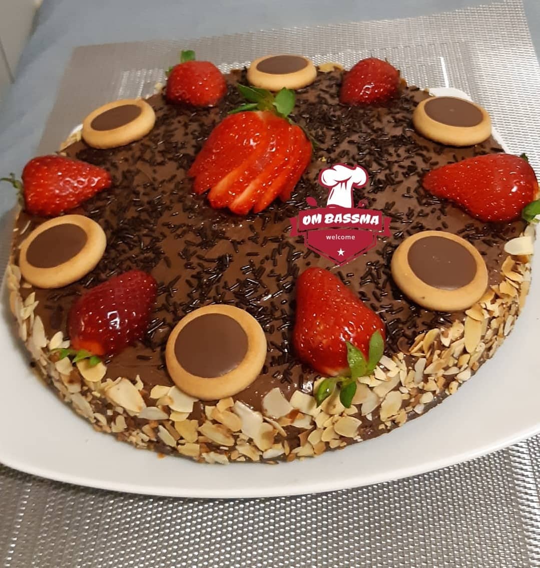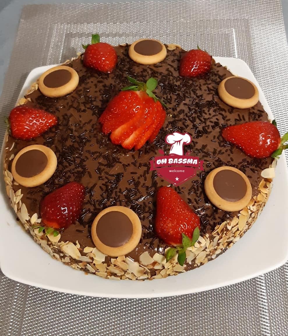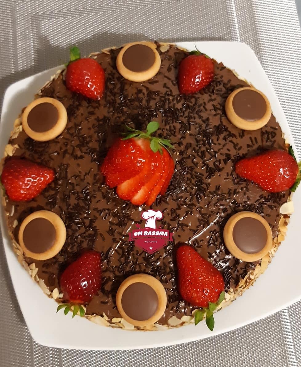 عند إخراجها نزينها بالشكلاطة نوتيلا ونلصف رقائق اللوز من الجوانب وزينتها من الأعلى بالفراولة وحبات من الميني تارتولات أو نزين حسب الرغبة
