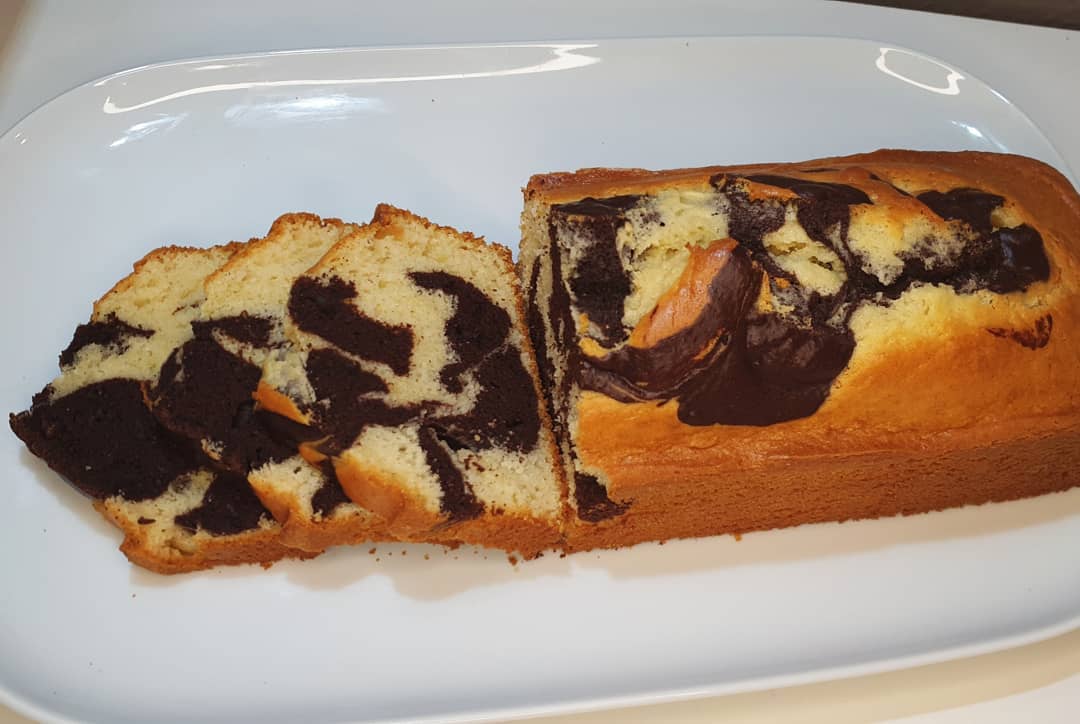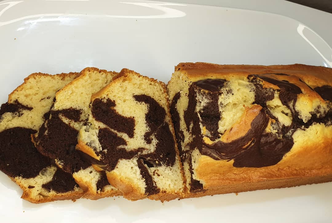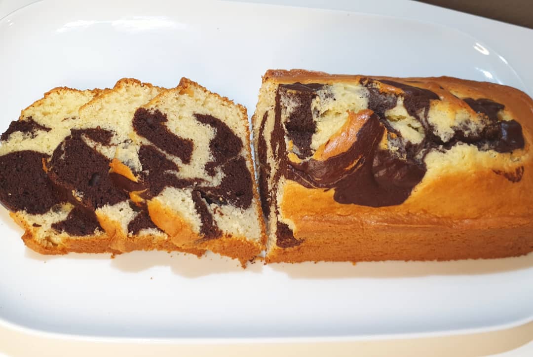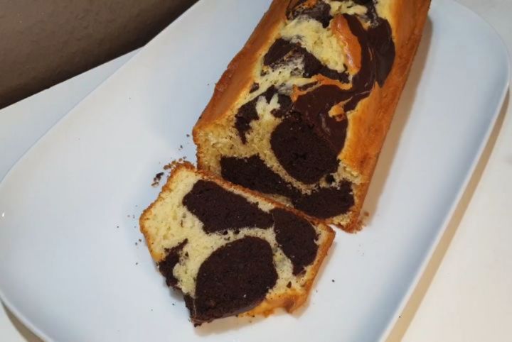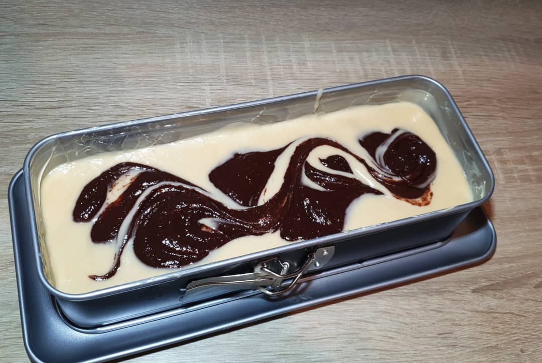 كنقسمو الخليط على زوج الأول نخليوه ابيض وتاني نضيفو ليه 3 ملاعق كاكاو مغربل نخلطوهم وكناخدو مول مدهون بالزبدة ونديرو طبقات من الخليط الأبيض والكاكاو وفالأخير نحركو بملعقة